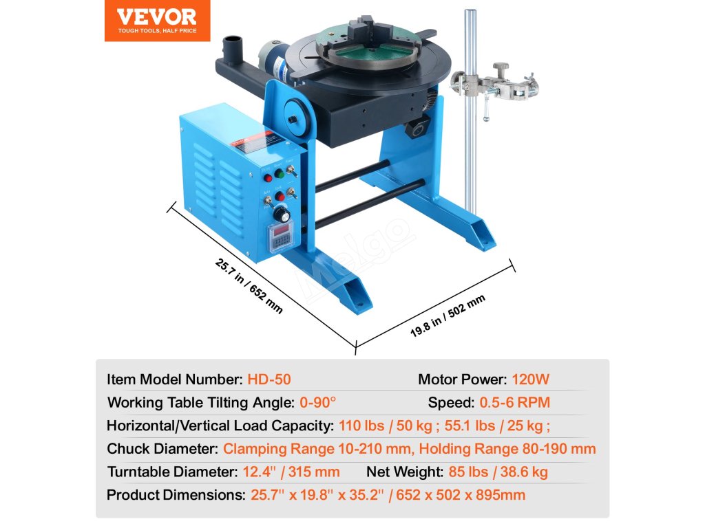Zvolte si rotační polohovací zařízení VEVOR, abyste mohli svařovat bez námahy a přesně. Pozvedněte své svářečské dovednosti a dosáhněte výjimečných svarů díky pracovnímu stolu s náklonem 0-90°, plynulé regulaci otáček 0,5-6 ot/min, tříčelisťovému sklíčidlu KD200, silné nosnosti, snadno ovladatelné ovládací skříňce a držáku svářecí pistole.