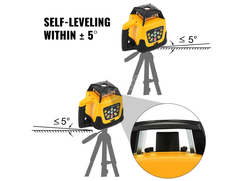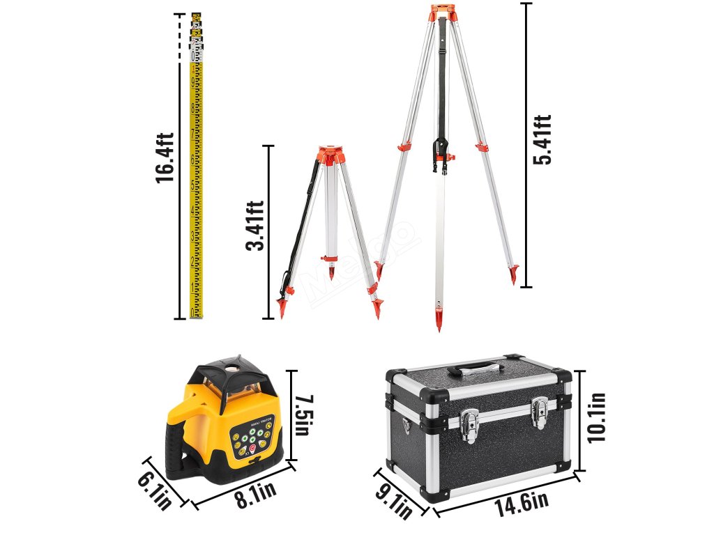 Tato sada laserového nivelačního nářadí se skládá z laserové vodováhy, stativu o délce 5,41 ft/1,65 m a tyče o délce 16,4 ft/5 m, které jsou vyrobeny z pevného, ale lehkého plastu a hliníku. Tato laserová vodováha s pracovní vzdáleností 1640,42 ft/500 m a otočnou konstrukcí o 360 stupňů vytváří stabilní skenovací linie pro maximální viditelnost za světelných podmínek. Díky nastavitelné výšce a vodorovné základně může stativ pojmout více geodetických zařízení pro různé účely nivelace a měření. Naše výrobky jsou vhodné pro použití ve stavebnictví, na železnici, při údržbě silnic a dalších venkovních aplikacích.