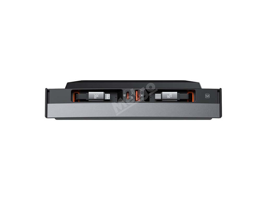 Je také vybaven 2 zatahovacími kabely USB-C, každý o délce 0,8 m, takže je mohou používat i cestující na zadních sedadlech - díky magnetickým konektorům je lze snadno uložit. Porty USB-A a USB-C navíc umožňují připojení dalších zařízení, například sluchátek TWS nebo herního ovladače. Rozbočovač také umožňuje přenos dat (k dispozici pro modely 3 a Y)