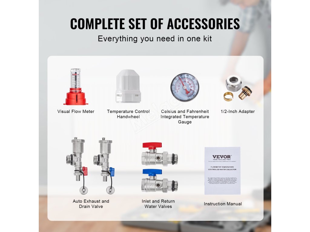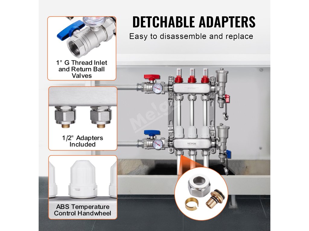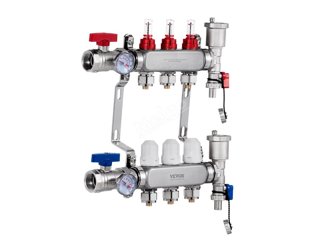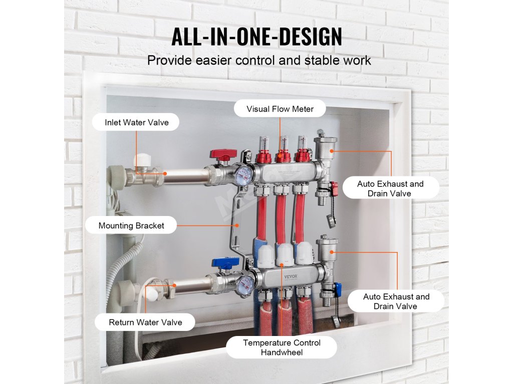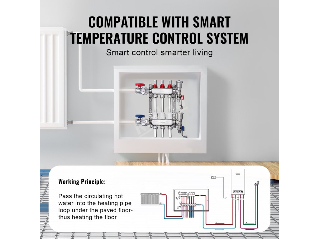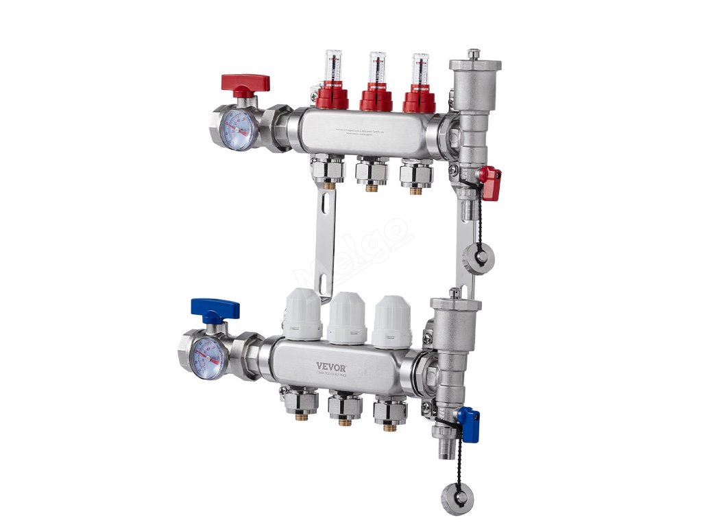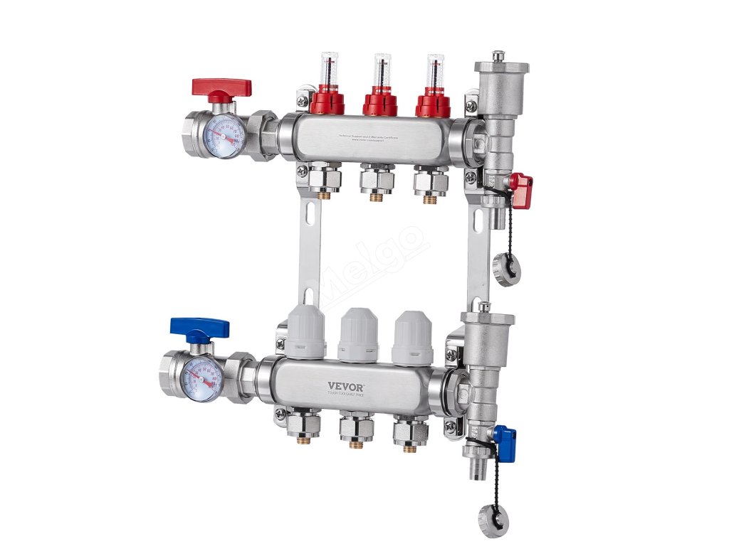 Tato sada rozdělovače pro sálavé podlahové vytápění pex, vybavená vizuálními uzavíracími ventily s průtokoměrem na vstupní větvi, umožňuje přesné nastavení průtoku vody a zabraňuje nerovnoměrnému rozvodu.2 Ukazatele teploty zobrazují hodnoty ve stupních Fahrenheita i Celsia, takže máte k dispozici jasné údaje o teplotě.