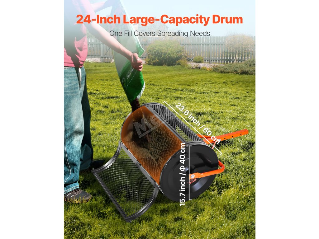 24palcový buben pojme až 2,66 krychlových stop osiva, hnojiva, vápna, ornice nebo písku. Velkokapacitní buben je určen pro velké plochy, jako jsou trávníky, zahrady a zemědělské pozemky, a zkracuje dobu doplňování paliva a zvyšuje produktivitu.