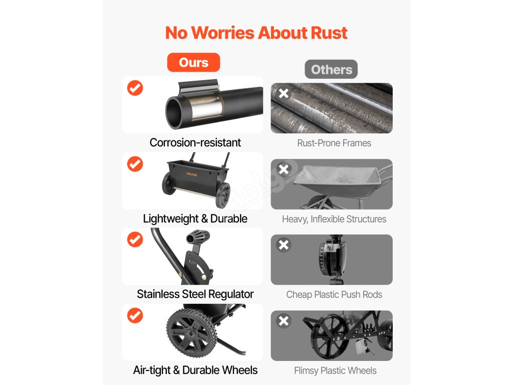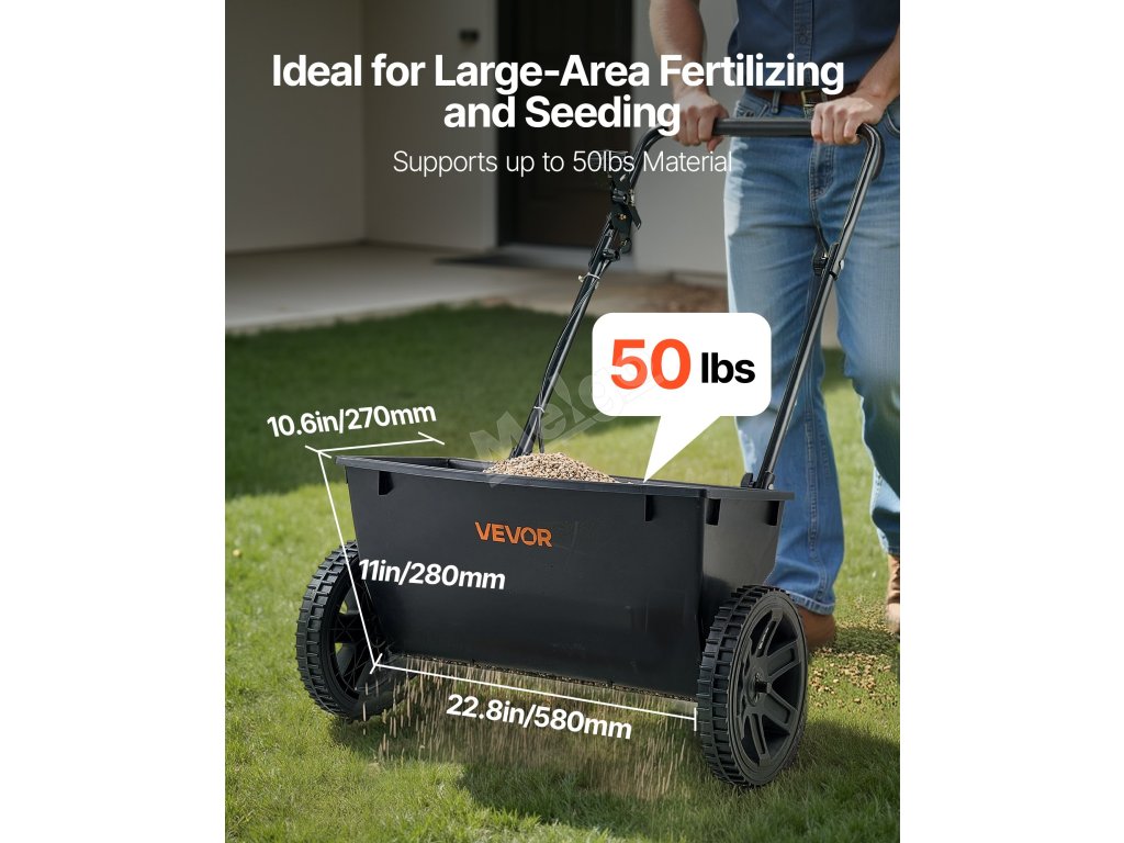 Rám z vojenské oceli je odolný proti korozi, má 10palcová pneumatická kola a 18palcové přesné rozpětí. Montáž kol trvá pouhých 5 minut a nabízí celoroční pokrytí osivem, hnojivem a tajícím ledem. Ušetřete čas a námahu a zároveň vytvořte profesionální trávník na úrovni!