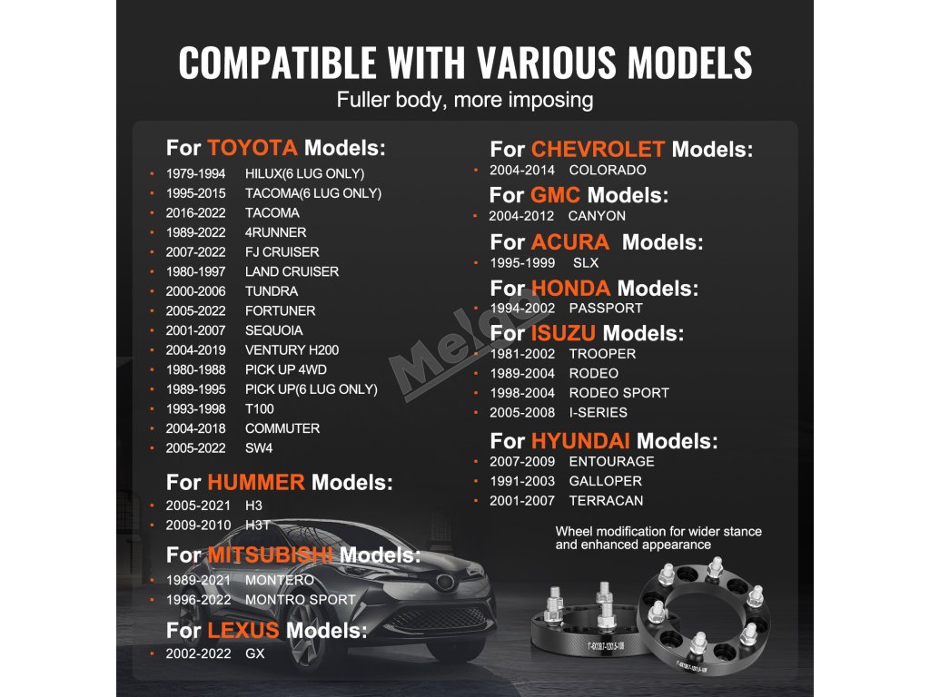 Tyto distanční podložky jsou vhodné pro širokou škálu modelů vozidel. Před nákupem si prosím ověřte kompatibilitu s modely. Máte-li jakékoli dotazy ohledně našich distančních podložek pod kola, neváhejte nás kontaktovat a my vám rádi pomůžeme.