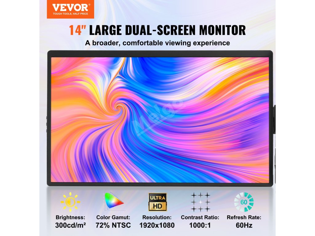 Obsahuje veškeré potřebné příslušenství: 1 kabel mini HDMI, 1 multifunkční kabel USB typu C a 1 kabel pro přímé připojení typu C. Monitor VEVOR pro obrazovku notebooku váží pouhých 2,6 kg a zaručuje efektivní práci kdekoli.