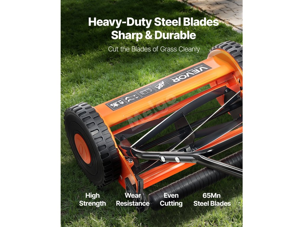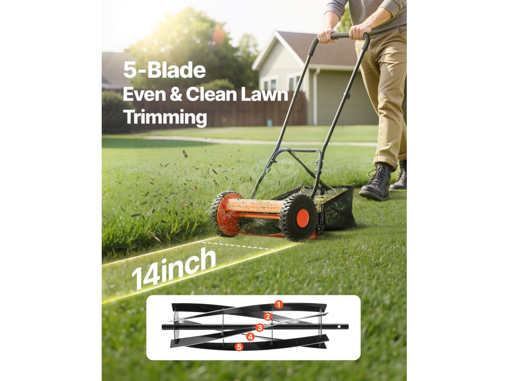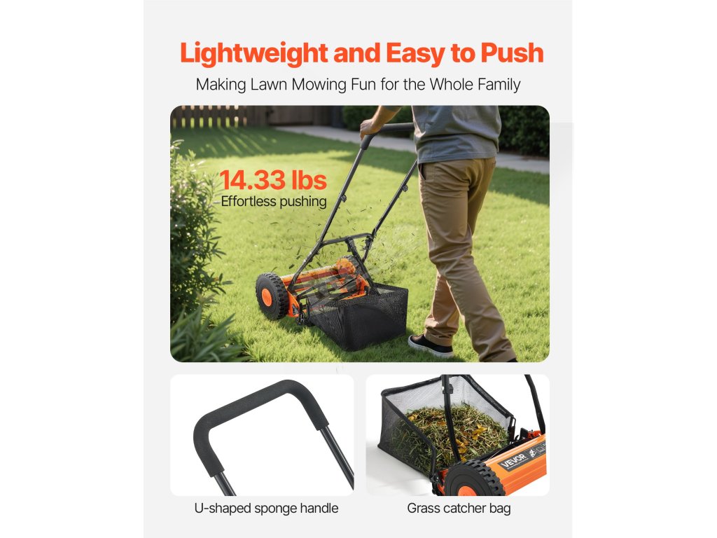 Tato 14palcová ruční sekačka s pěti noži z oceli 65 Mn poskytuje přesný a rovnoměrný střih pro malé až středně velké trávníky. Konstrukce s nastavitelnou výškou se přizpůsobí různým typům trávy a velká kola a houbová rukojeť snižují námahu při sečení. Přiložený sběrný vak na trávu usnadňuje čištění.