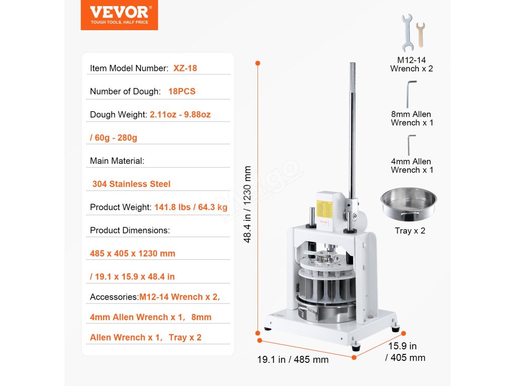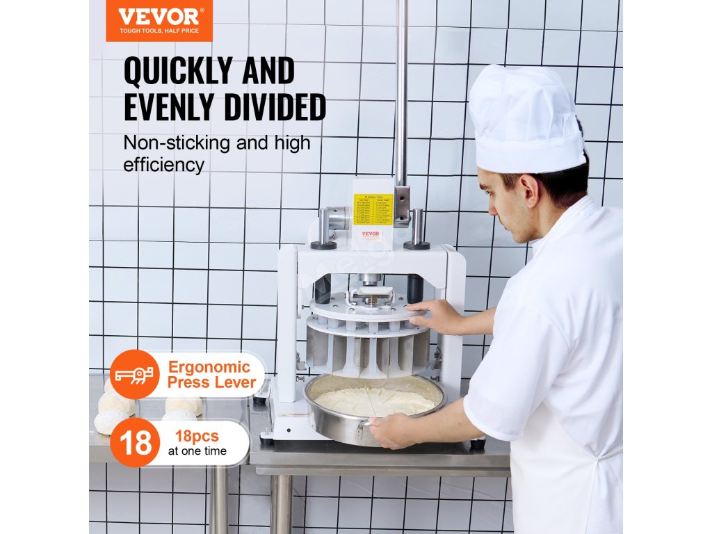 Stroj dokáže rozdělit velké těsto na 18 rovnoměrně velkých porcí najednou, přičemž každá porce váží od 60 do 280 gramů (2,11 až 9,88 oz).
