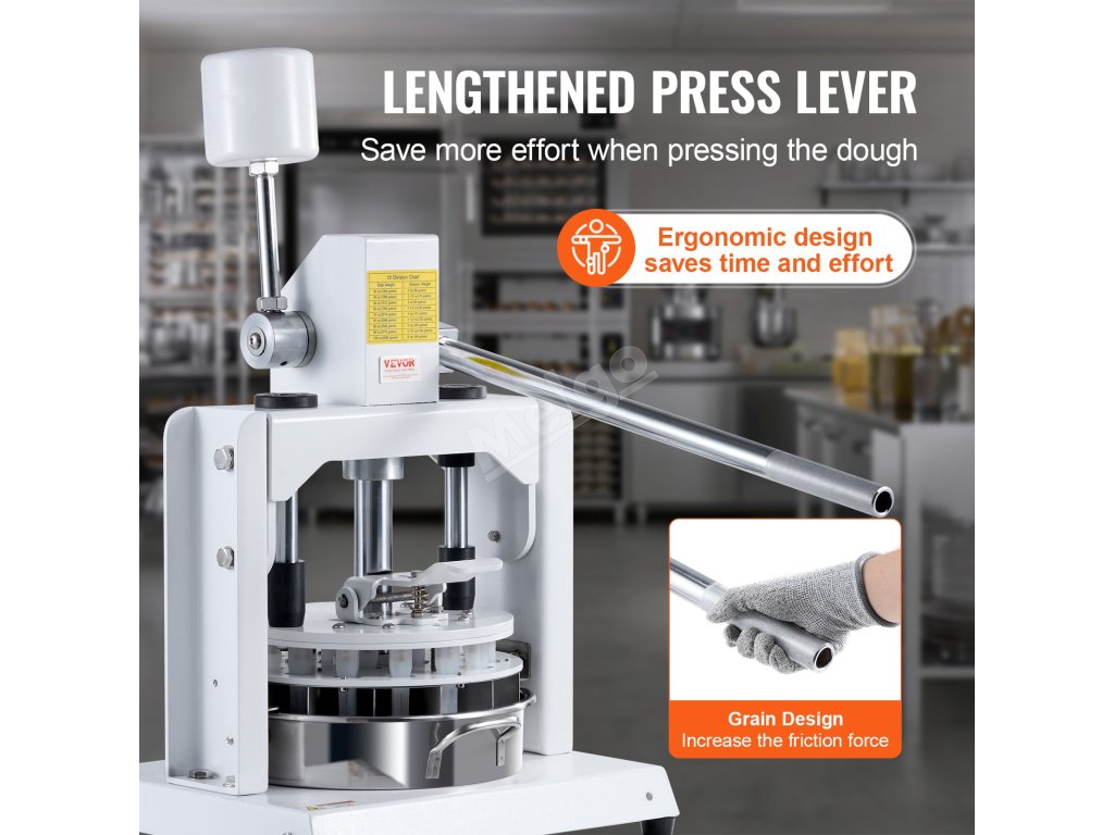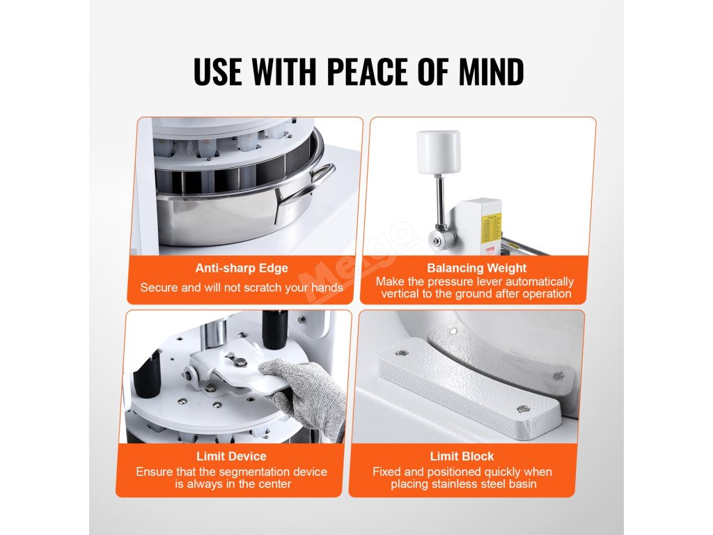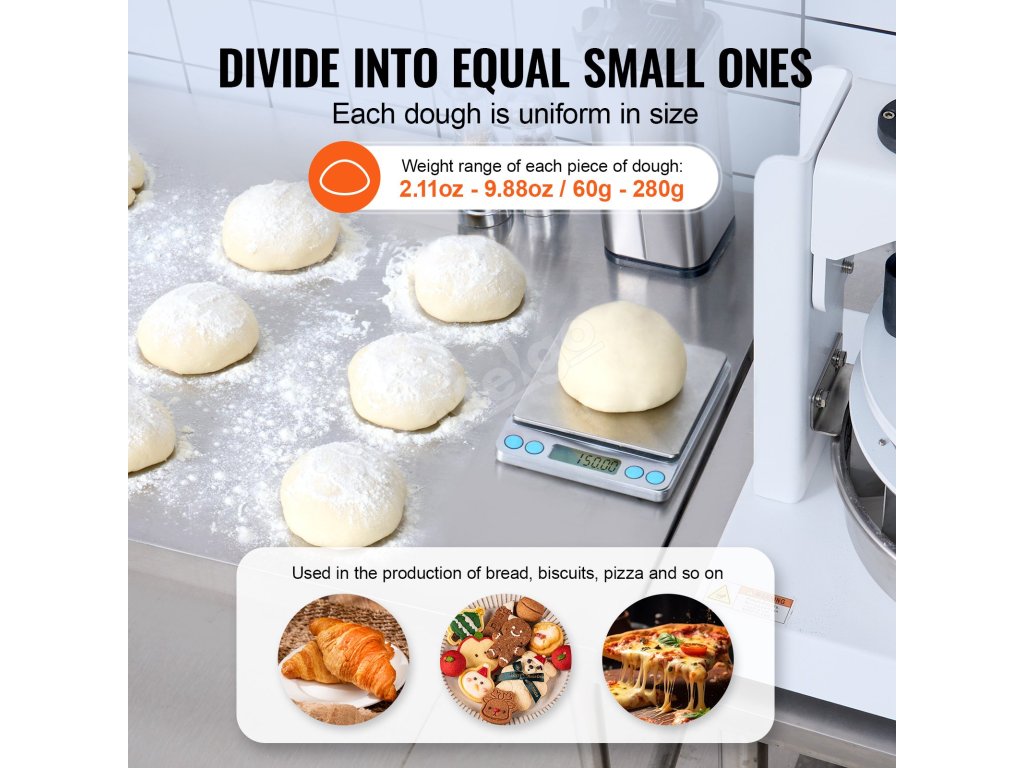 Tento dělič těsta je ideální pro přípravu pečiva, pizzy, sušenek, hamburgerů, chleba a dalších pokrmů. Je vhodný pro použití v restauracích, školách, továrnách, pekárnách a dalších prostředích s velkým objemem výroby potravin.