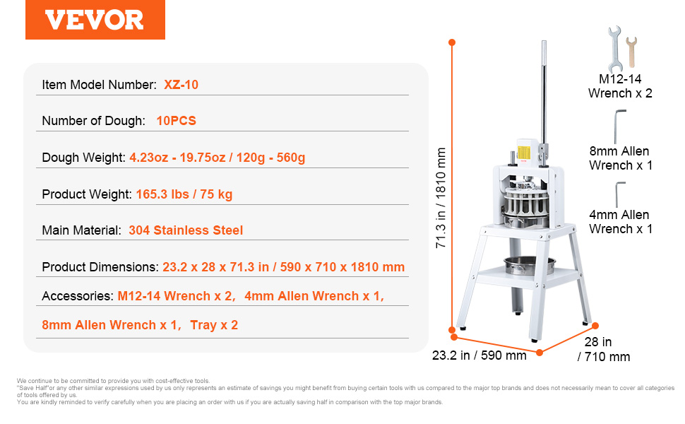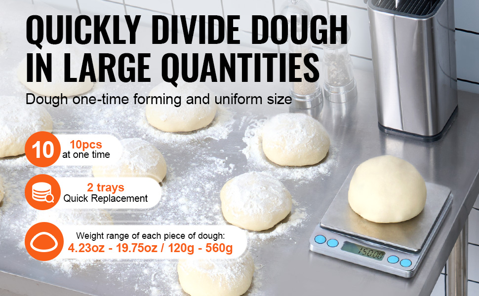Přístroj dokáže rozdělit velké těsto na 10 rovnoměrně velkých porcí najednou, přičemž každá porce váží od 120 do 560 gramů (4,23 až 19,75 oz).