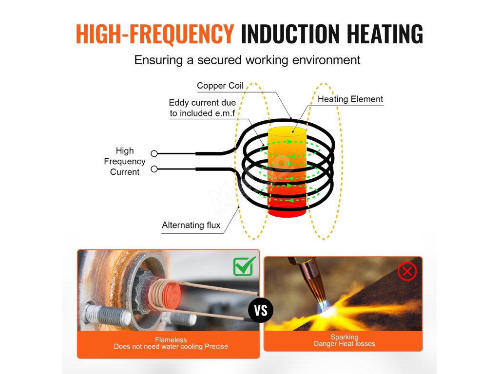 Tento indukční ohřívač využívá vysokofrekvenční magnetické pole k ohřevu kovů bez otevřeného plamene, čímž minimalizuje riziko požáru. Přesný ohřev umožňuje bezpečné a přesné utahování šroubů a matic, což snižuje poškození okolních součástí.