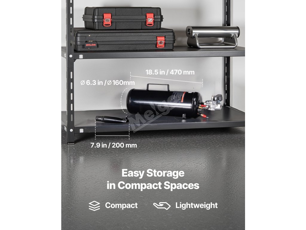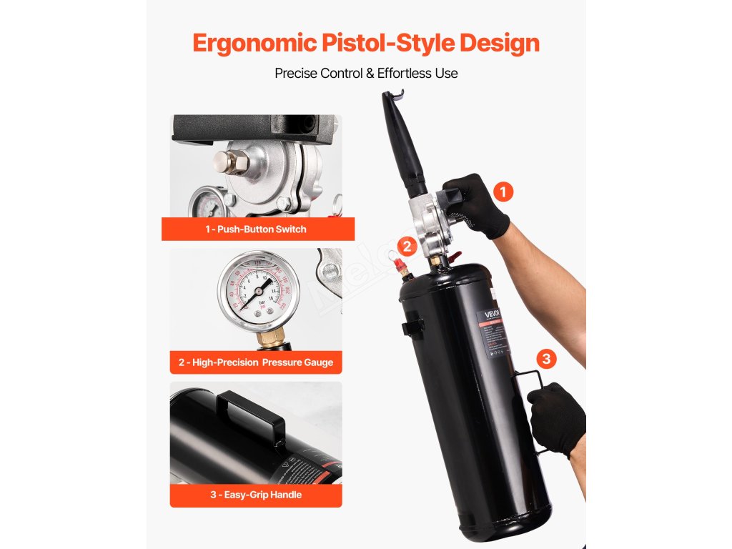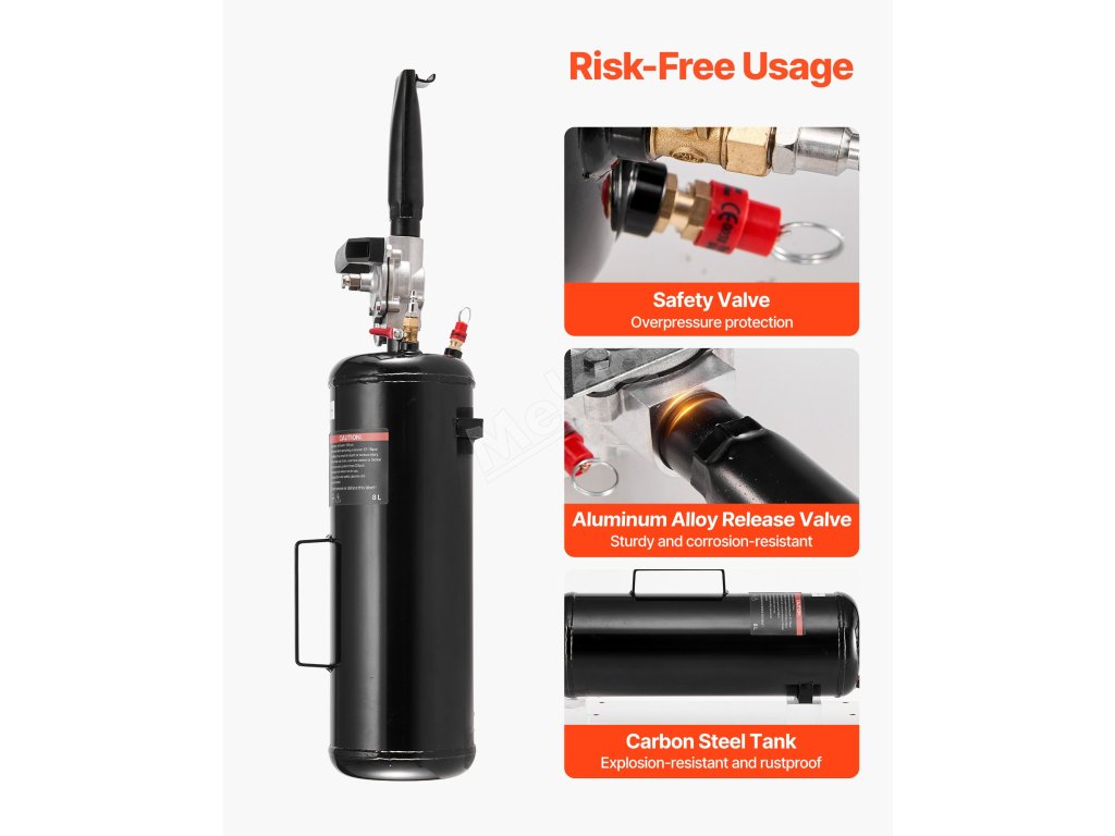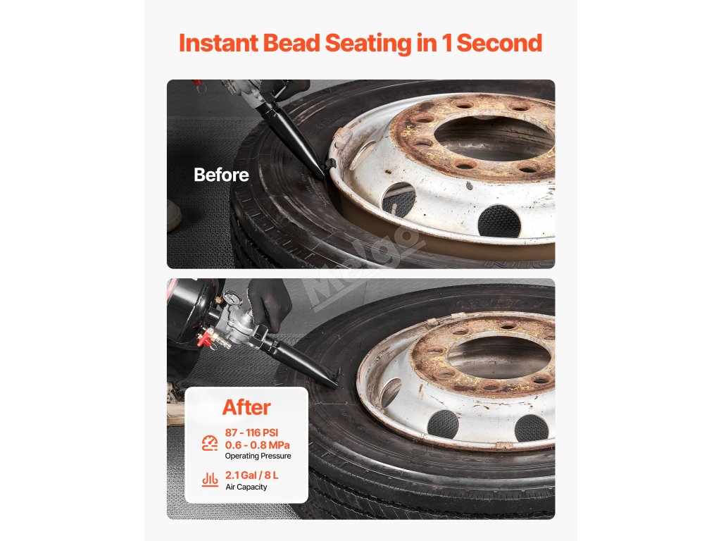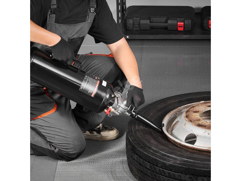 2.1 galon / 8 litrů rychle uvolňuje vysokotlaký vzduch, který usadí patku pneumatiky do správné polohy během pouhé 1 sekundy, takže huštění patky pneumatiky je bezproblémové a šetří práci.