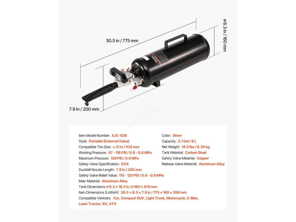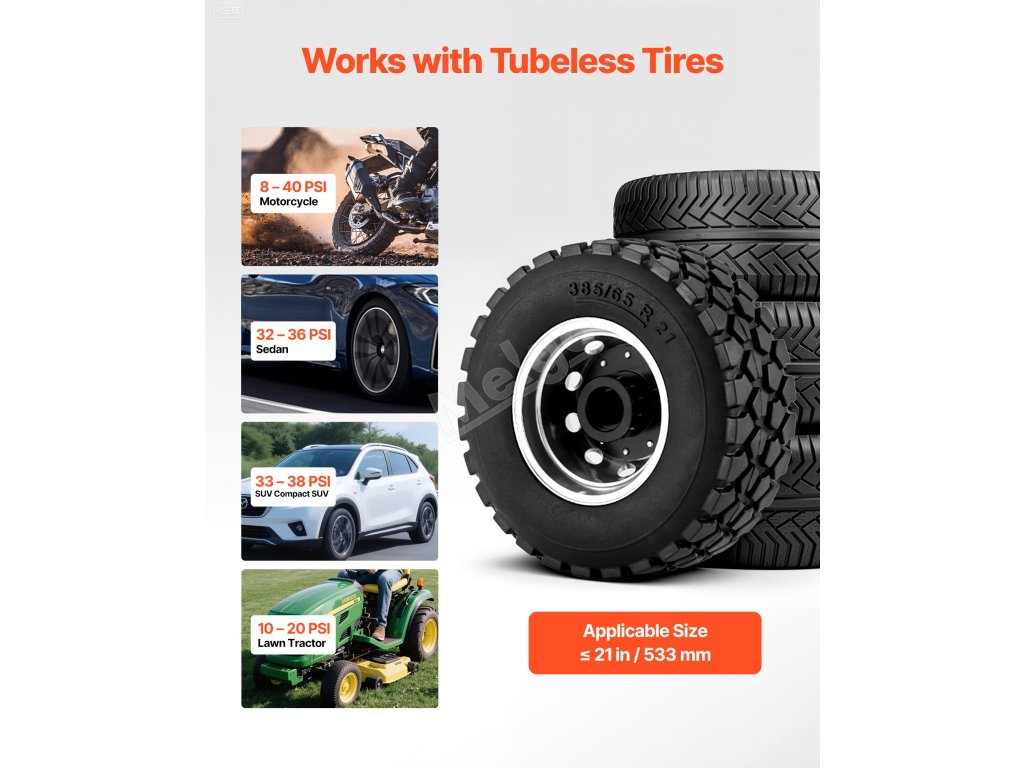Podporuje bezdušové pneumatiky o průměru ≤ 21 palců/533 mm včetně osobních automobilů, kompaktních SUV, malých nákladních vozidel, motocyklů, elektrokol, čtyřkolek a sekaček na trávu. Provozní tlak: 87-116 PSI / 0,6-0,8 MPa. Hustotu vzduchu nastavte podle velikosti pneumatiky.