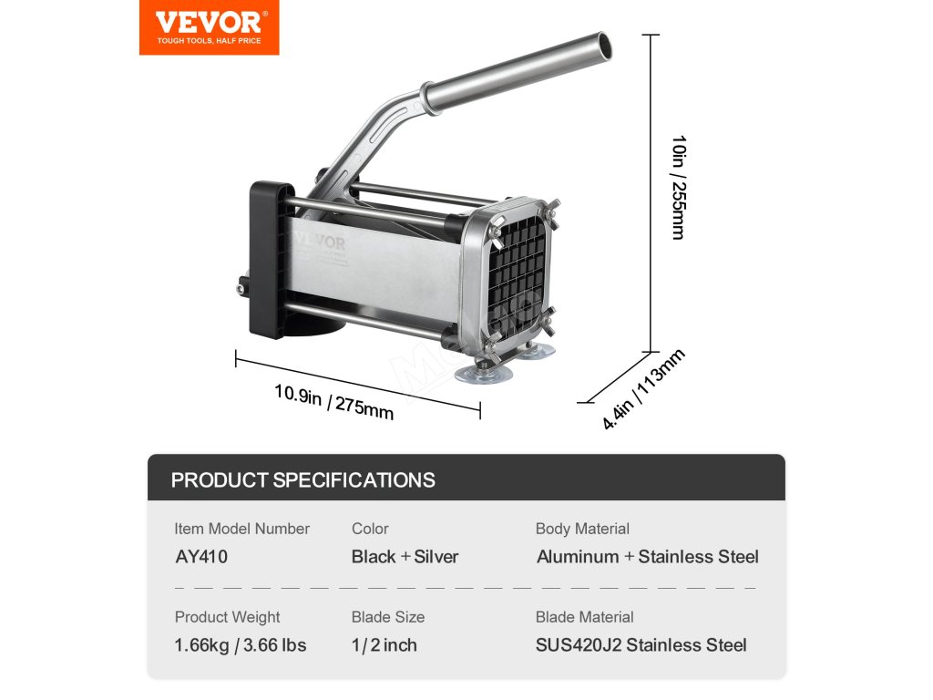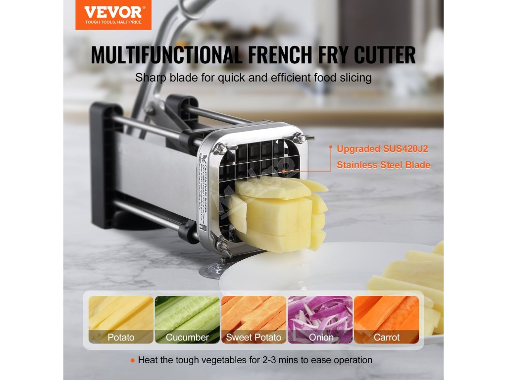 Kráječ na hranolky je vybaven vylepšeným 1/2palcovým nožem z potravinářské nerezové oceli SUS420J2. Ergonomická protiskluzová páková rukojeť umožňuje krájet potraviny bez námahy, čímž šetří vaši energii a čas.