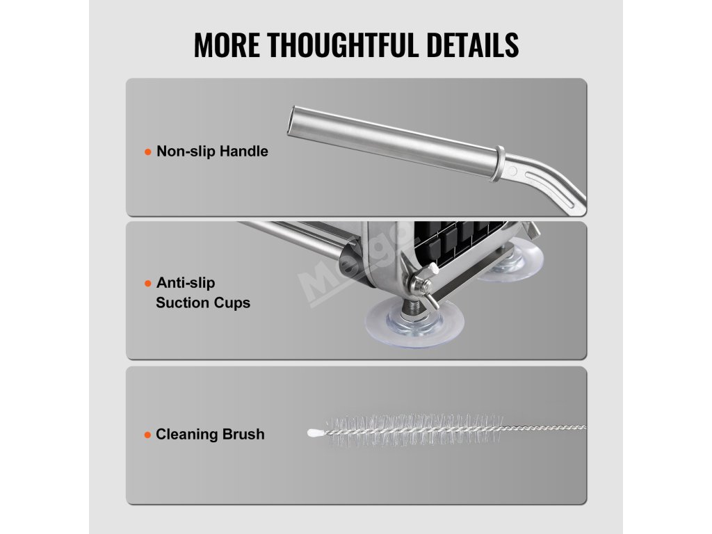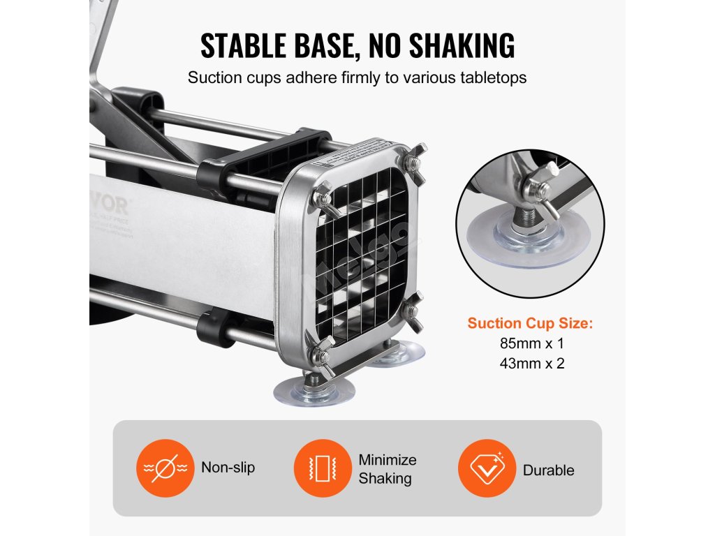 Je vybaven ostrým nožem a ergonomickou pákou se 3 protiskluzovými přísavnými nožkami pro lepší stabilitu. Výkonné odsávání zajišťuje odolnost proti uklouznutí při práci. Bez námahy s ním nakrájíte zeleninu, jako jsou brambory, mrkev, okurky, a dokonce i tvrdší druhy, například sladké brambory.