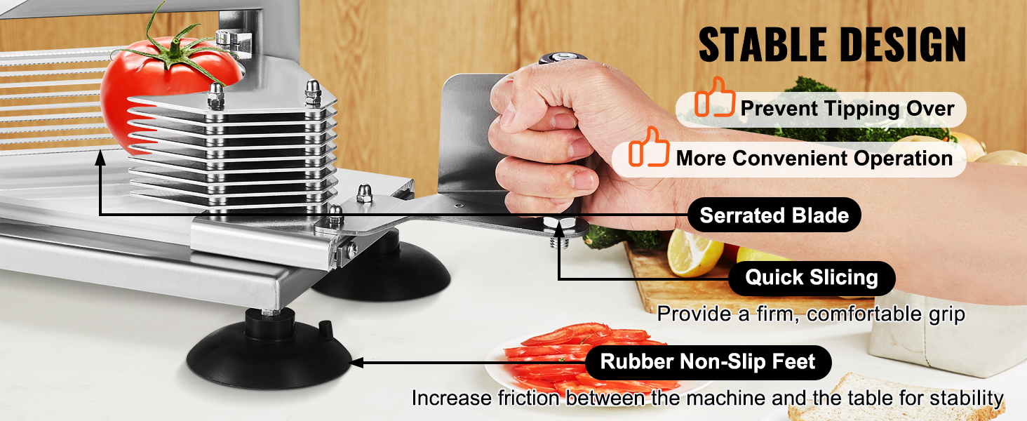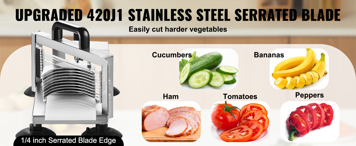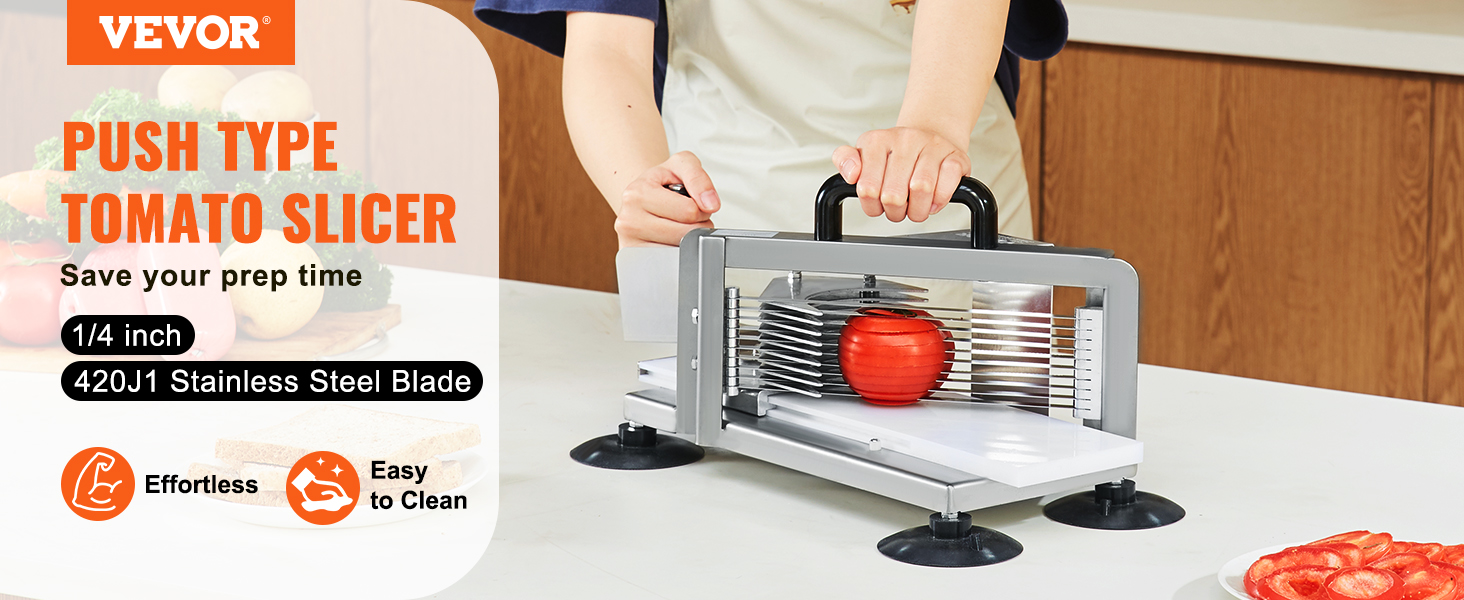 Tento kráječ na rajčata je vybaven noži z nerezové oceli 420J1 a bez námahy krájí různé druhy zeleniny. Díky svému ergonomickému a pracnému designu výrazně zvyšuje vaši produktivitu a šetří váš drahocenný čas při přípravě pokrmů.