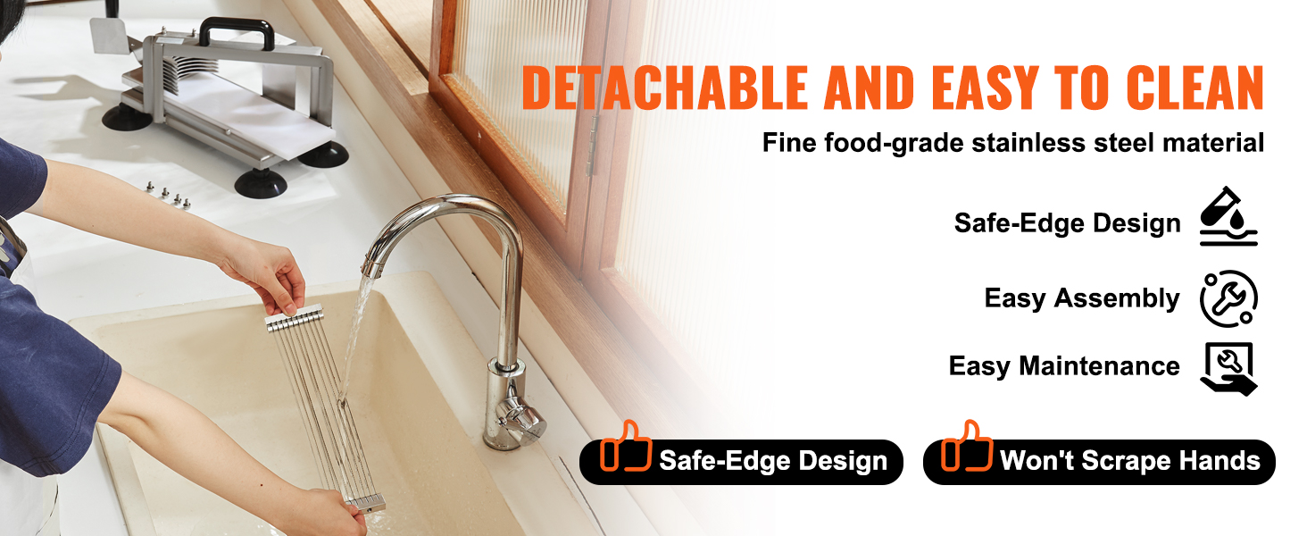 Součásti čepele a hlavy lze snadno oddělit. Všechny části kráječe na rajčata jsou omyvatelné, odolné proti korozi a trvanlivé.
