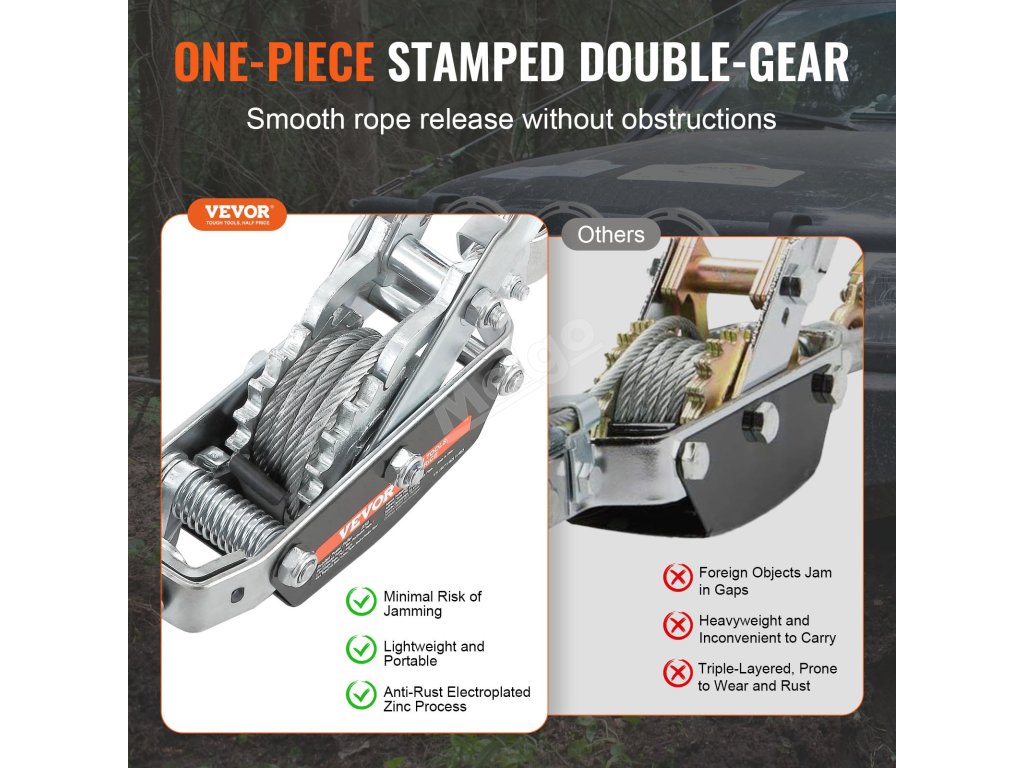Rozlučte se s tradičními skládanými převody, které se zasekávají a rezaví. Jednodílná konstrukce našeho stahováku Come Along se dvěma převody zajišťuje hladké uvolnění lana a dlouhotrvající pevnost. Tomu říkáme efektivita!