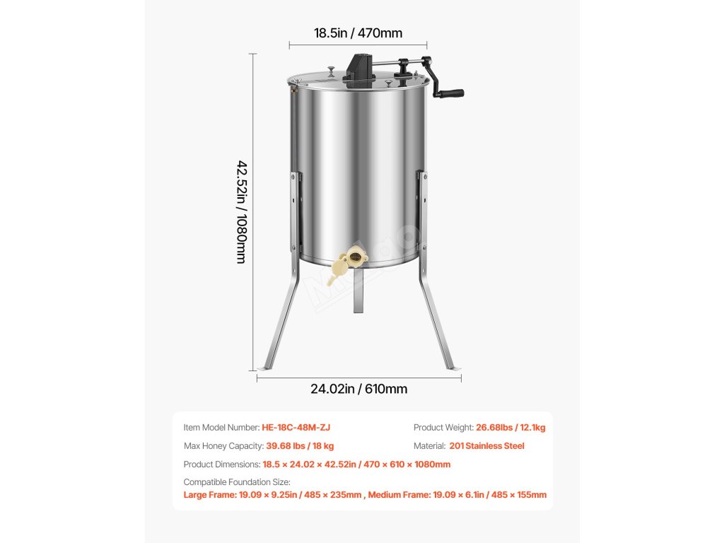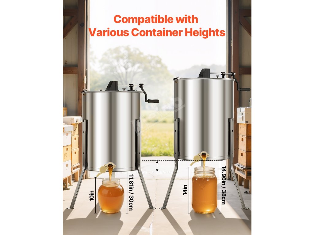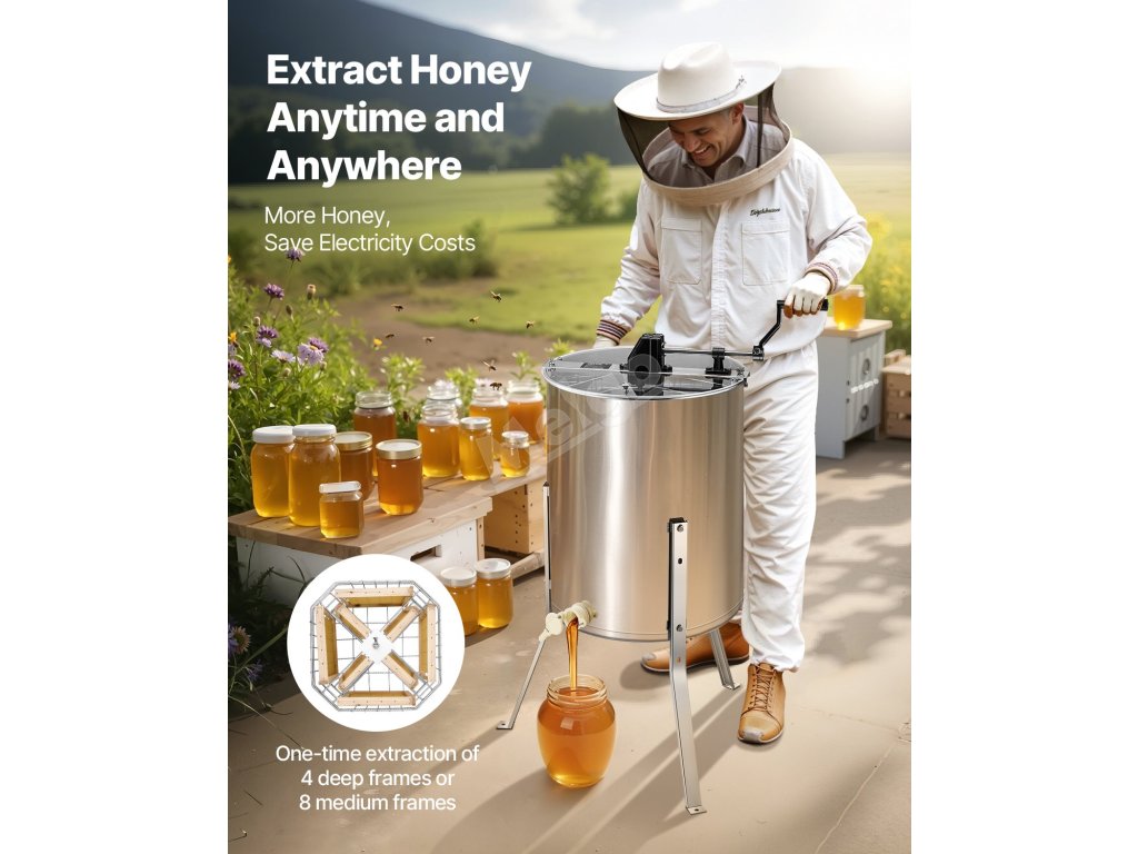 Tento medomet má nastavitelnou výšku, robustní rám z nerezové oceli pro stabilní provoz. S veškerým potřebným příslušenstvím se snadno používá, je vhodný pro hluboké, střední i mělké rámy a nabízí plynulé vytáčení medu s nastavitelnou rychlostí pro optimální účinnost.