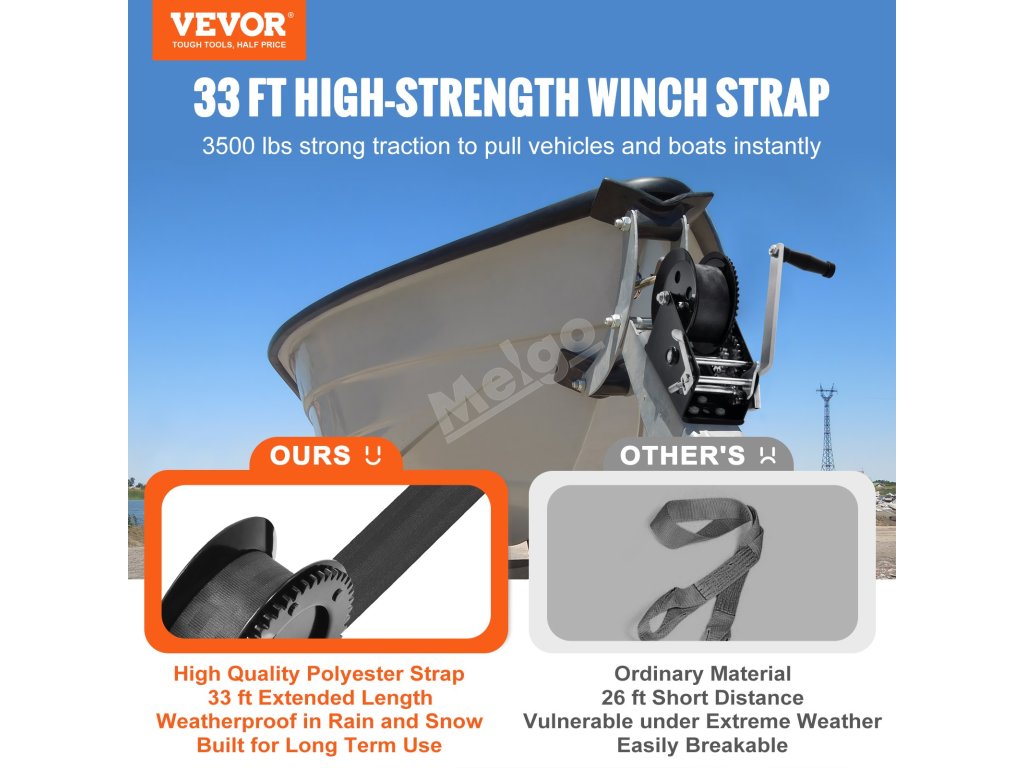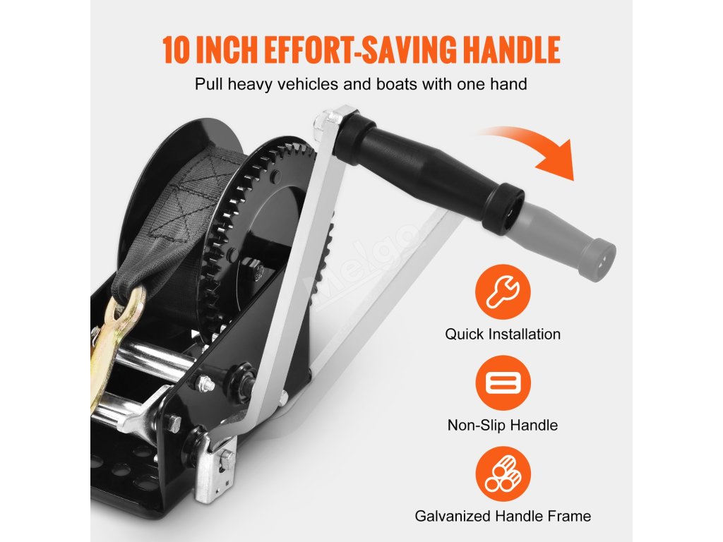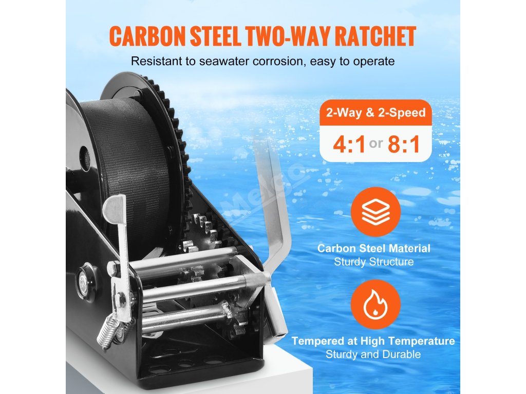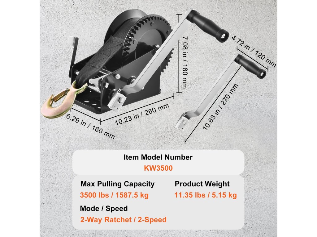 Váš nový pomocník při náročných tazích - náš ruční naviják. S nosností 3500 liber, 33 stopami popruhu, dvourychlostní obousměrnou ráčnou 4:1/8:1 a 10palcovou snadno uchopitelnou rukojetí je připraven stát se vaším profesionálem pro tažení na cestách.