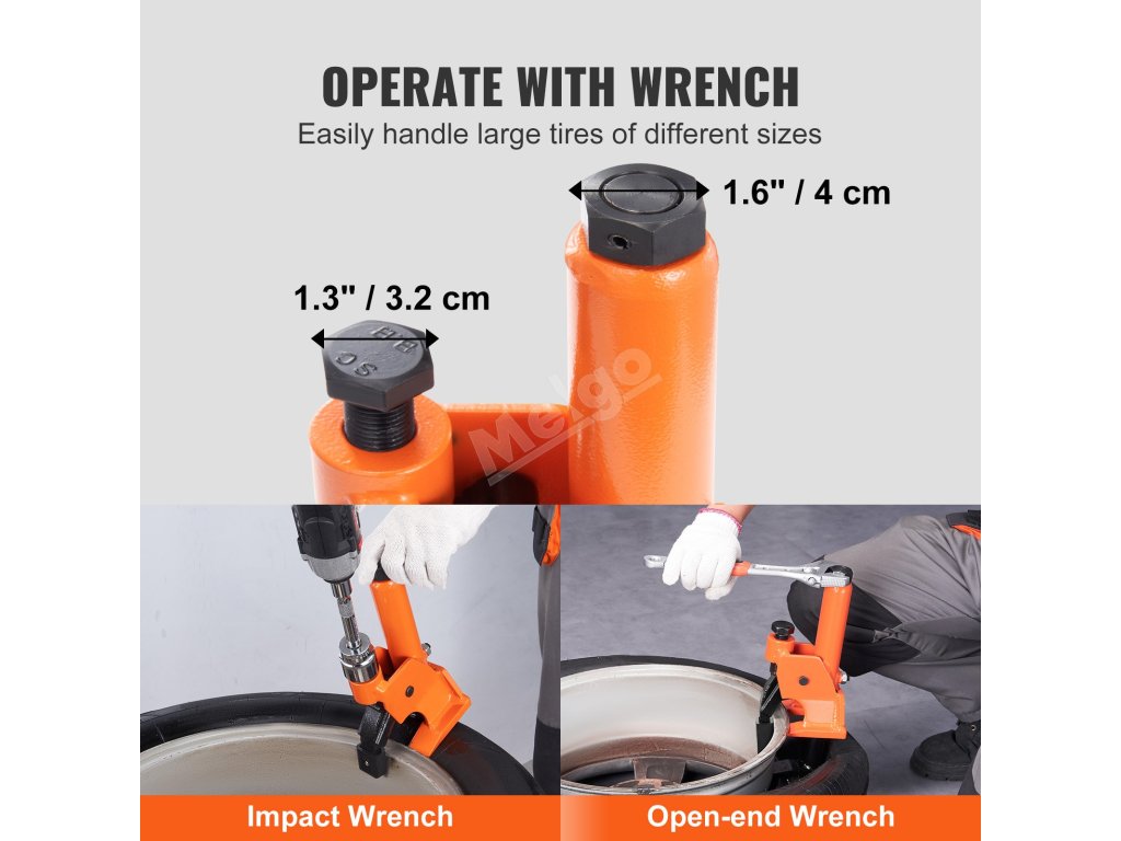 K nastavení a upnutí náboje použijte otevřený klíč, rázový klíč nebo pneumatický ráčnový klíč a poté změnou hnacího šroubu ve 2-3 polohách vyvinete tlak na patku, abyste pneumatiku snadno oddělili.