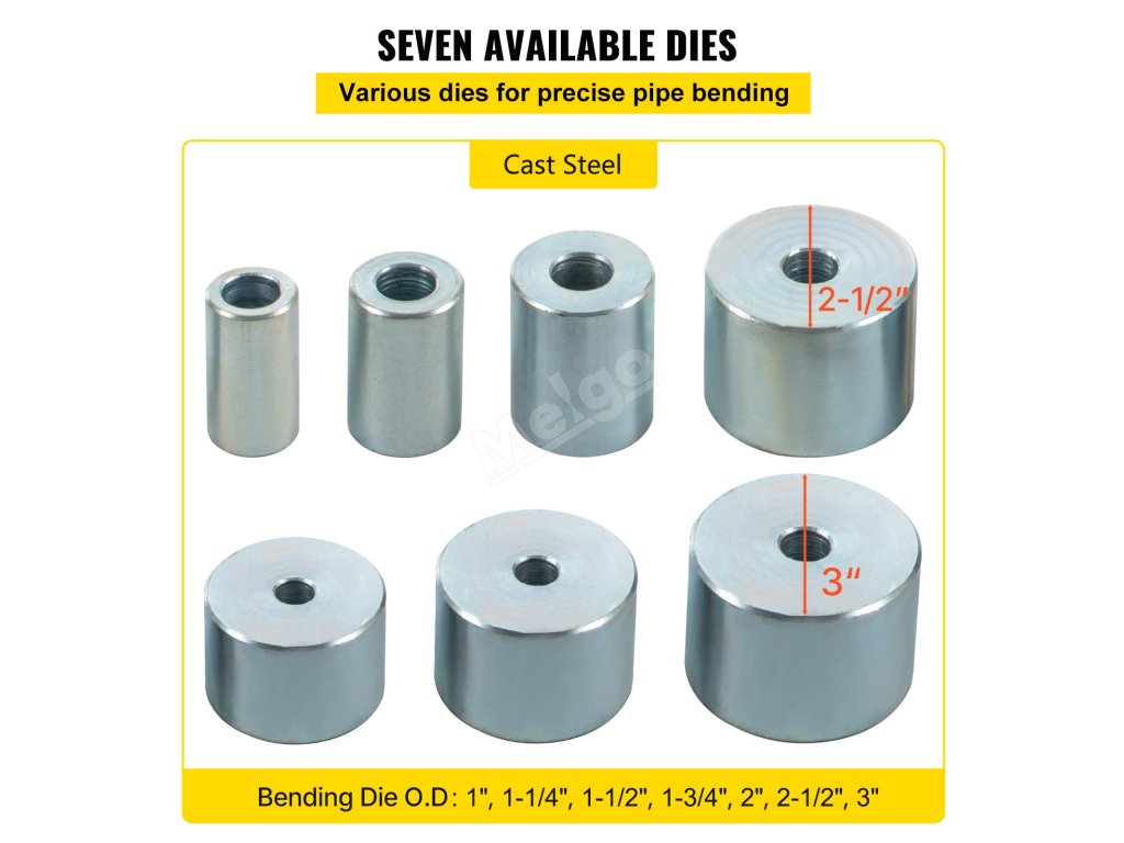 K dispozici je 7 kulatých raznic o průměru od 1" do 3". Tuto ohýbačku lze použít k úpravě držáků a podpěr jiných dílů na staveništi a umožňuje vytvářet neomezené množství konstrukcí.