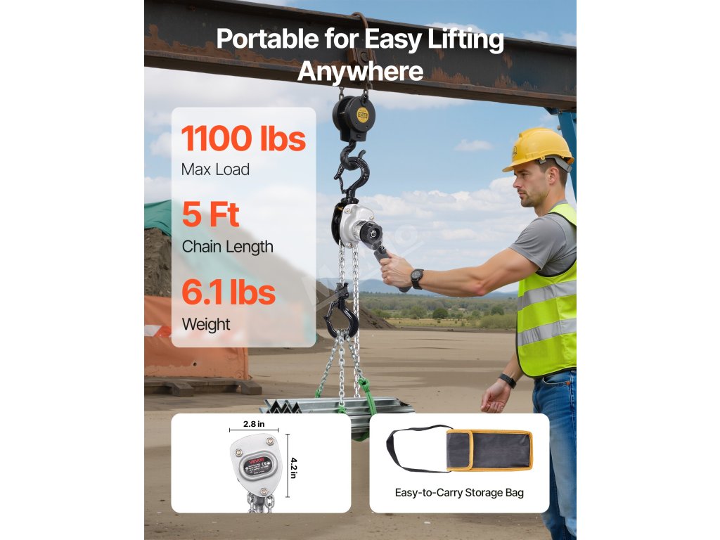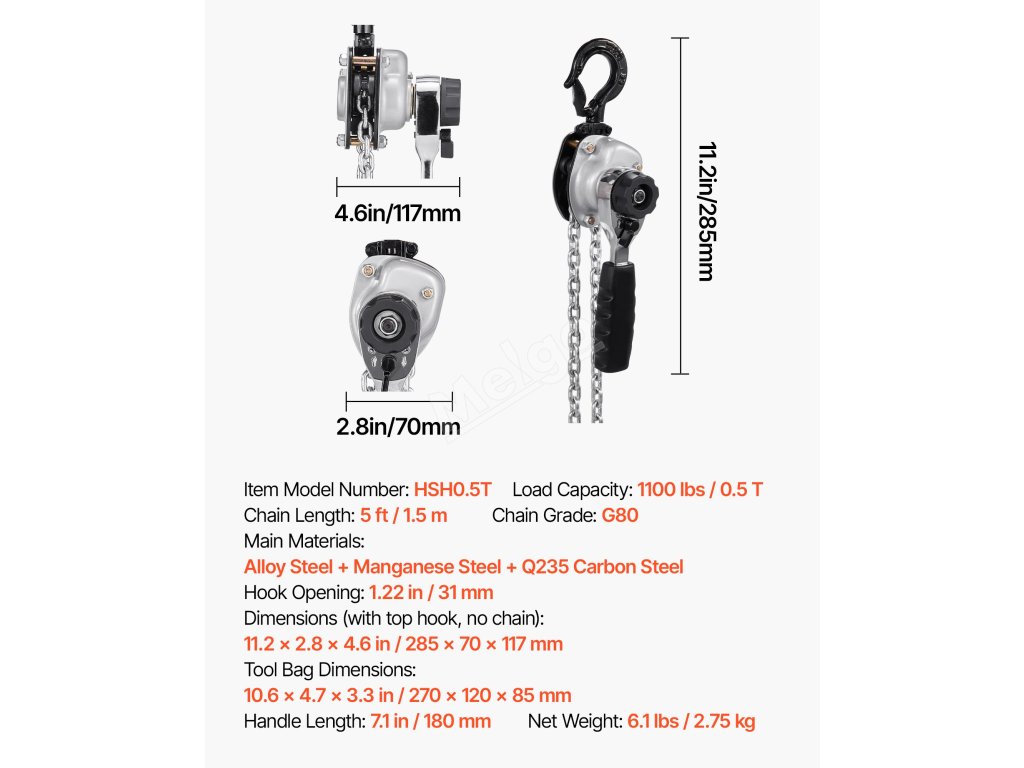 Ruční pákový řetězový zvedák 500 kg, zdvih 1,5m, G80, 360° háky