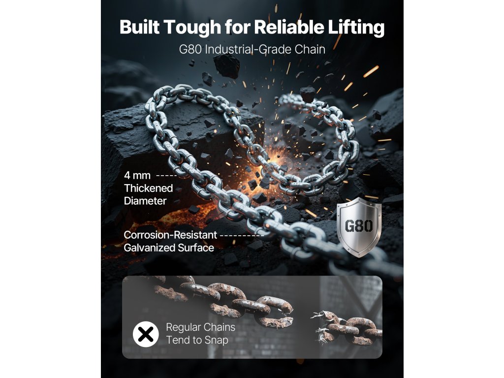Vyrobeno z průmyslového řetězu G80, který je konstruován tak, aby odolal velkému zatížení. Pozinkovaná povrchová úprava nabízí odolnost proti korozi a trvanlivost a je vhodná do různých pracovních podmínek.