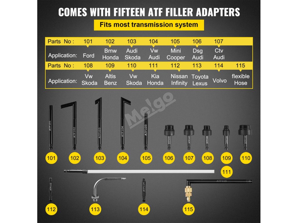 Patnáct kusů plnicích adaptérů převodovky ve stylu OE je zabaleno v úložném kufříku, adaptéry jsou vhodné pro většinu vozidel na trhu, jako jsou Audi, BMW, Mercedes, Lexus, Porsche, Nissan, Ford, VW a další.