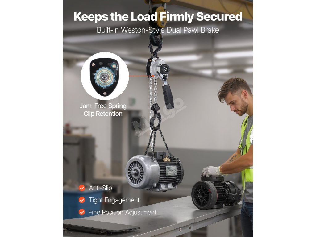 Je vybaven vnitřní dvojitou ráčnovou brzdou typu Weston, která rovnoměrně rozkládá těžká břemena. Zajišťuje bezpečné uchycení břemene a zabraňuje náhodnému pádu, čímž zvyšuje bezpečnost zvedání.