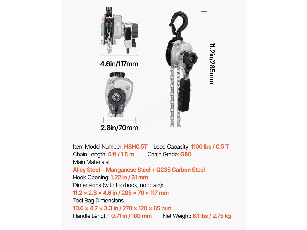 Vyrobeno z průmyslového řetězu G80, který je konstruován tak, aby odolal velkému zatížení. Pozinkovaná povrchová úprava nabízí odolnost proti korozi a trvanlivost a je vhodná do různých pracovních podmínek.