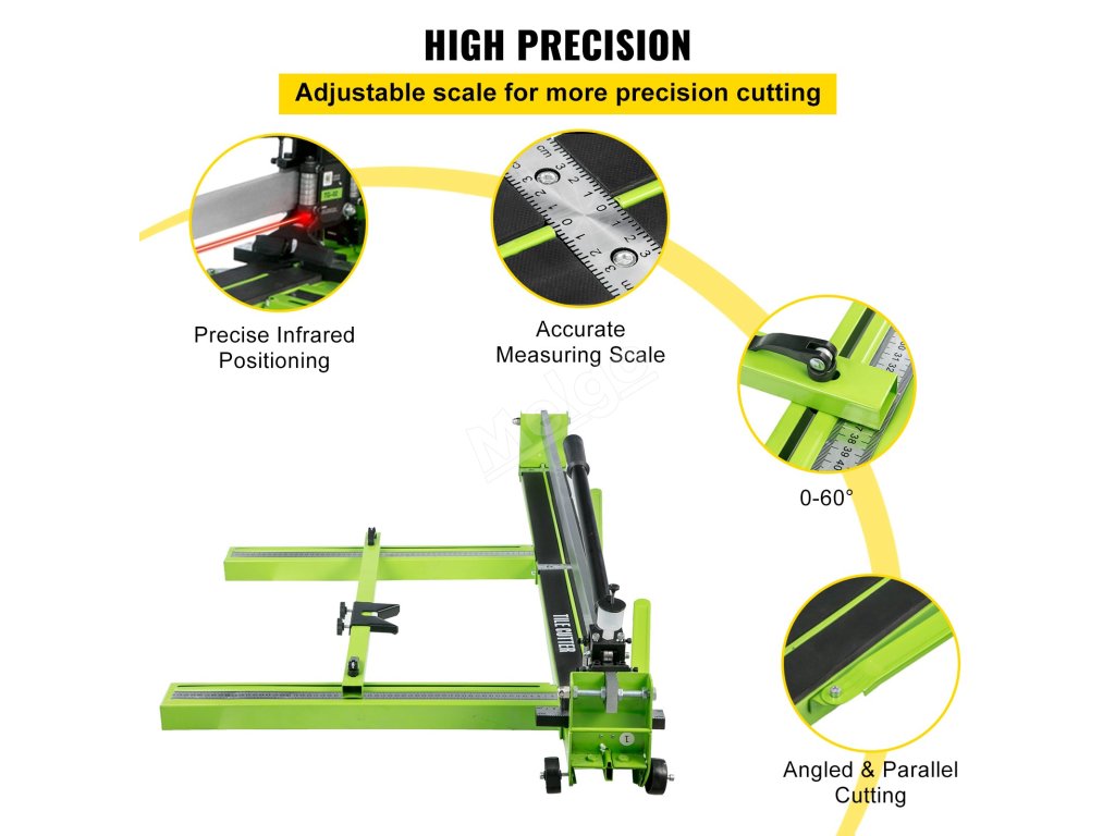Použité laserové polohování, modernizovaná tři hliníková pravítka a úhlové řezy pro přesné řezání. Řezání dlaždic bez námahy.