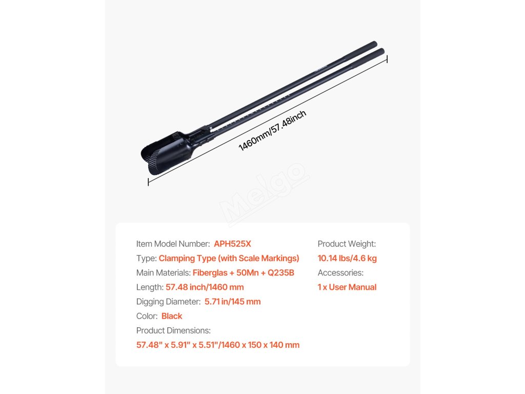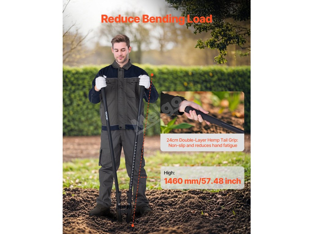 Díky celkové délce 57,48 palce/1460 mm omezuje náš ruční bagr časté ohýbání. Dvouvrstvá konopná koncovka zvyšuje pohodlí při uchopení a zřetelné značení stupnice vám pomůže přesně změřit hloubku jámy při kopání.