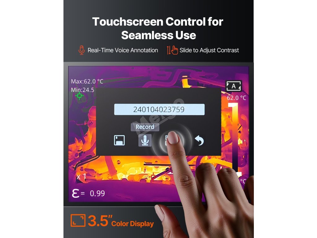 Tato termokamera je vybavena infračerveným displejem s rozlišením 256×192, který poskytuje jasné termální snímky a odhaluje skryté problémy dříve, než se zhorší. Po pořízení snímku můžete přímo na 3,5palcovém dotykovém displeji přidávat poznámky pro snadnou dokumentaci a organizaci.