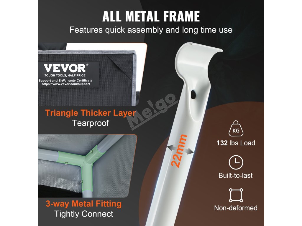 Pestovateľský stan VEVOR 4x4 má robustný 22 mm oceľový rám. Poskytuje silnú oporu pre vaše rastliny a vybavenie. Rám je navrhnutý tak, aby udržal až 132 kg. Poťah z tkaniny 2000D Oxford zvyšuje odolnosť rámu. Hrubá a pevná tkanina zaručuje dlhodobé používanie. Materiál je odolný voči roztrhnutiu a opotrebovaniu, čo je dôležité pre zachovanie ideálneho prostredia pre pestovanie. Oceľový rám a látkový poťah spolupracujú na zabezpečení optimálnej, spoľahlivej a odolnej konštrukcie. Tento stan je navrhnutý tak, aby odolal výzvam záhradkárčenia v interiéri. Tomuto stanu môžete dôverovať pri všetkých svojich pestovateľských potrebách.