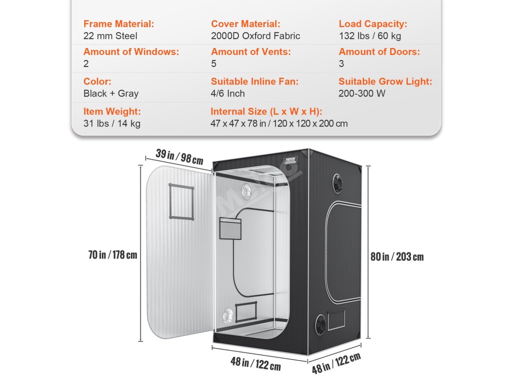 Priestranný dizajn s rozmermi 48'' x 48'' x 80'' ideálny pre rôzne potreby pestovania v interiéri