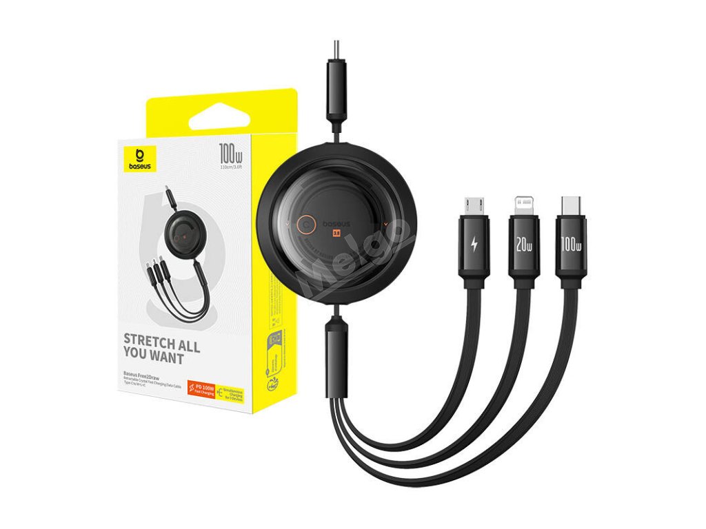 S kabelem Baseus Free2Draw 3 v 1 je nabíjení a přenos dat rychlý, pohodlný a bezproblémový. Díky možnosti nabíjet až tři zařízení současně je nepostradatelným společníkem na cestách, v práci i doma. Poskytuje maximální výkon až 100 W a jeho důmyslná konstrukce umožňuje čtyřstupňové nastavení délky.
