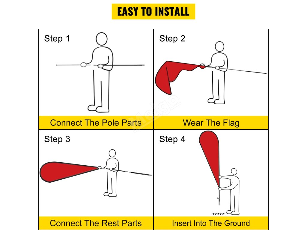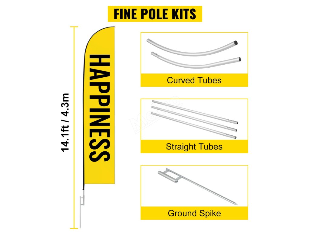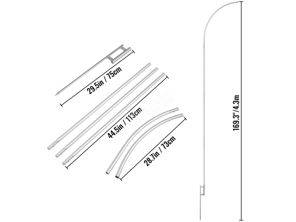 Délka: Celková délka našeho výrobku je 16 stop (bez zemních hřebíků) po spojení a výška výrobku je 14 stop/4,3 m po zapuštění do země. Průměr trubky: 0,98 in/25 mm; tloušťka stěny trubky: 0,05 in/1,2 mm. Každá sada trubek pro pérové vlajky obsahuje 5 trubek a 1 upevňovací tyč.
