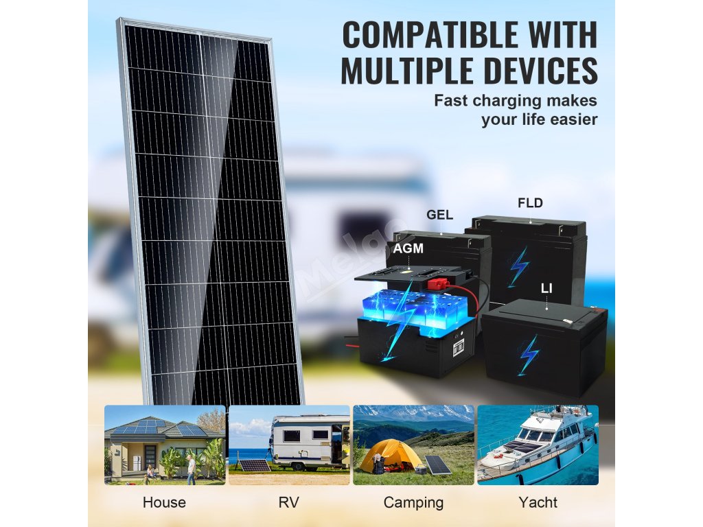 Zlepšete svůj životní styl s výkonným monokrystalickým solárním panelem VEVOR 100 W + regulátorem nabíjení. Pyšní se monokrystalickými solárními články a vysokým 23% konverzním poměrem, napájí váš dům, obytný vůz a jachtu, napájí vaše kempinkové vybavení a je kompatibilní s různými bateriemi AGM, GEL, FLD a LI.