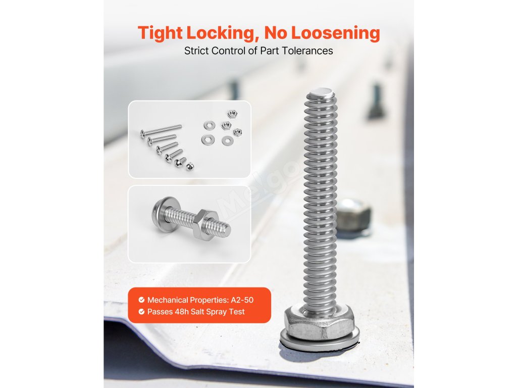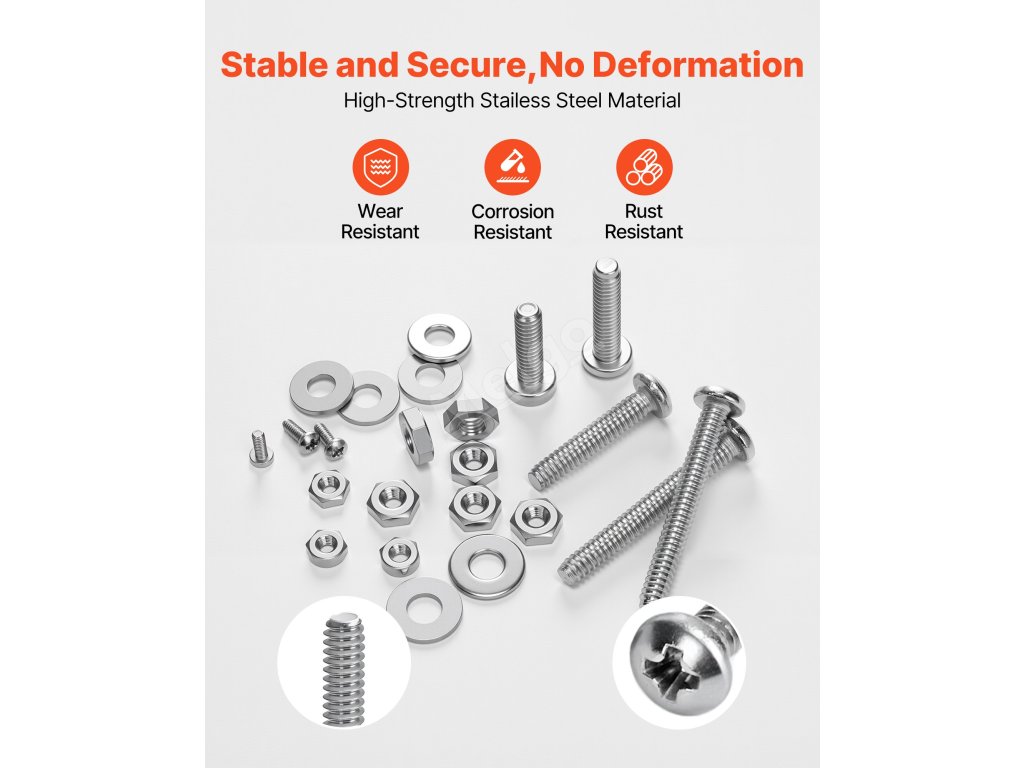 Díky širokému výběru šroubů, matic, podložek a dalších součástí různých velikostí poskytuje tato sada pevná spojení pro různé materiály a usnadňuje nalezení správných dílů pro vaši práci.