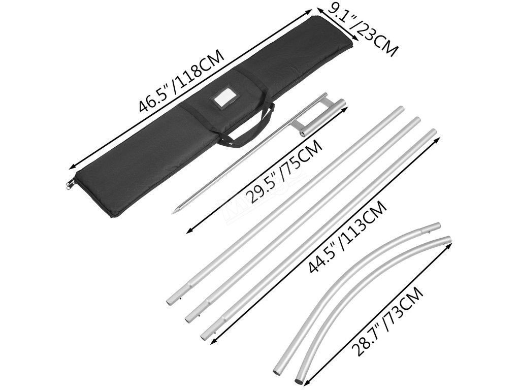 Celková délka našeho výrobku je 16 stop (bez zemních hřebíků) v kombinaci a výška výrobku je 14 stop/4,3 m při umístění do země. Průměr trubky: 0,98 in/25 mm; tloušťka stěny trubky: 0,05 in/1,2 mm. Každá sada trubek pro pérové vlajky obsahuje 5 trubek a 1 upevňovací tyč.
