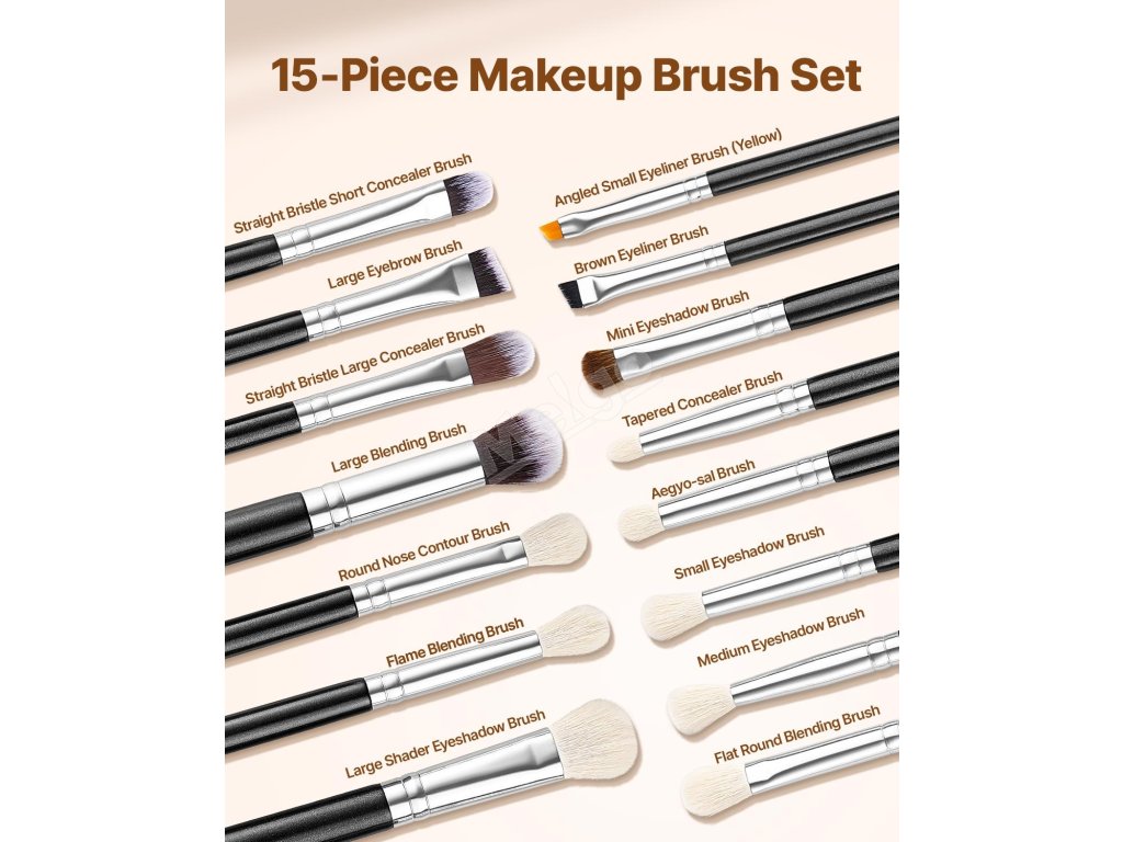 S touto 15dílnou profesionální sadou štětců na líčení snadno vytvoříte bezchybný vzhled! Obsahuje štětec na roztírání, štětec na oční stíny, štětec na oční linky, štětec na korektor, štětec na obočí, štětec na kontury nosu, štětec na oční linky atd. - ideální pro přirozený každodenní vzhled i sofistikovaný, okouzlující styl.