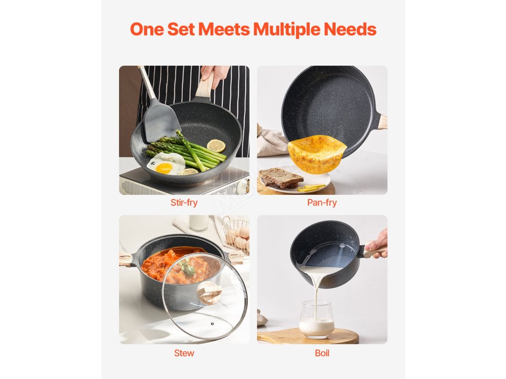 Stylový a moderní design integrovaného kuchyňského náčiní. Tato všestranná sada nádobí obsahuje různé kusy nádobí, které splní všechny vaše potřeby při vaření.