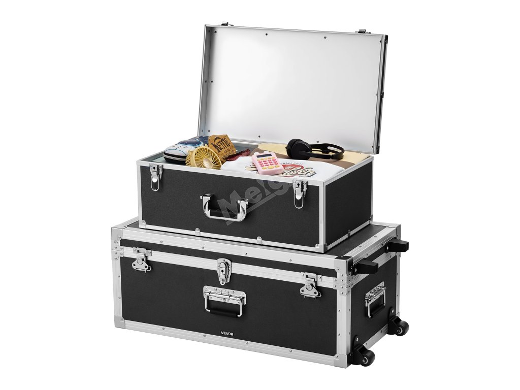 Sada 2 kovových úložných truhlic se zámky a kolečky, 3 rukojeti