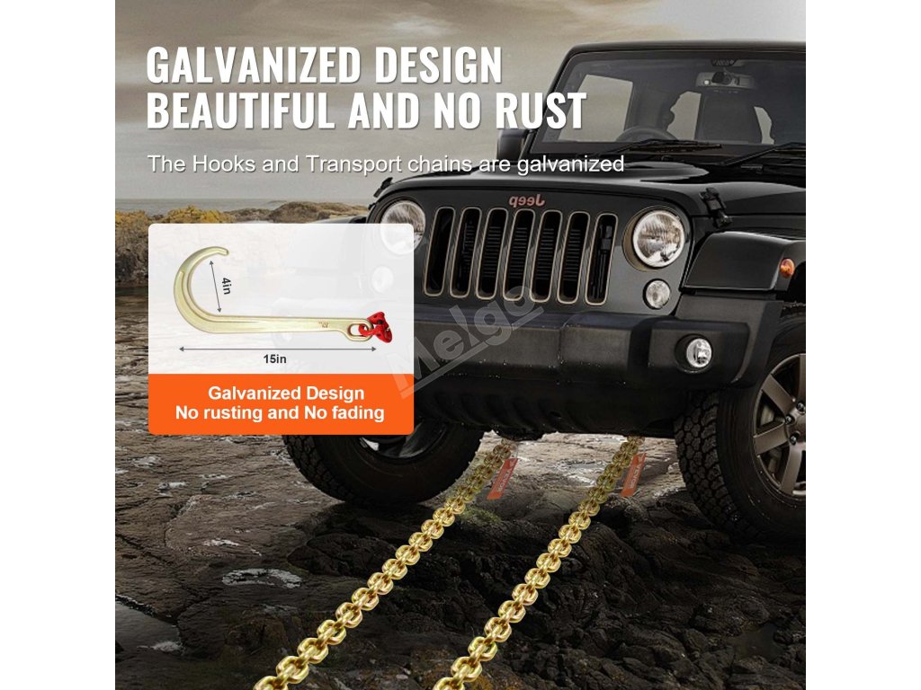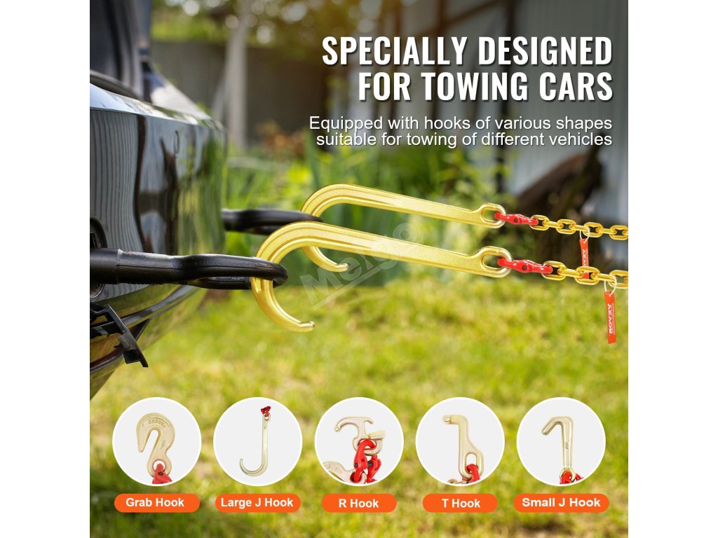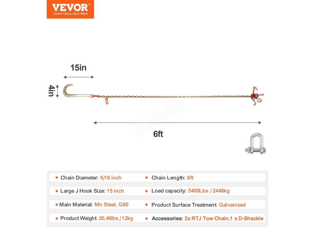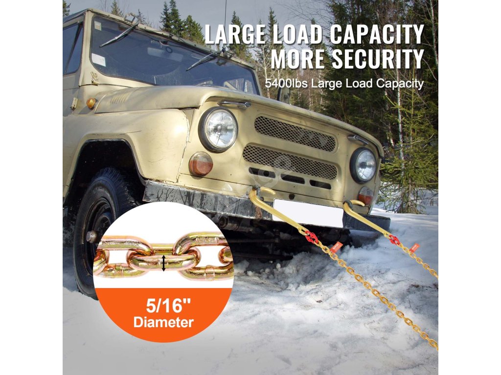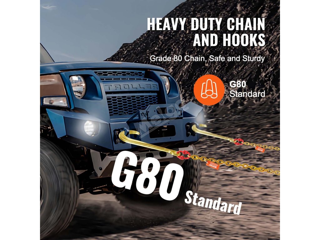 VEVOR, váš exkluzivní odborník na nářadí. Tento řetěz s J-hákem je vyroben z vysoce kvalitní oceli s celkovou pevností 80. stupně. Je také vybaven háky, které se hodí pro různé typy vozidel.