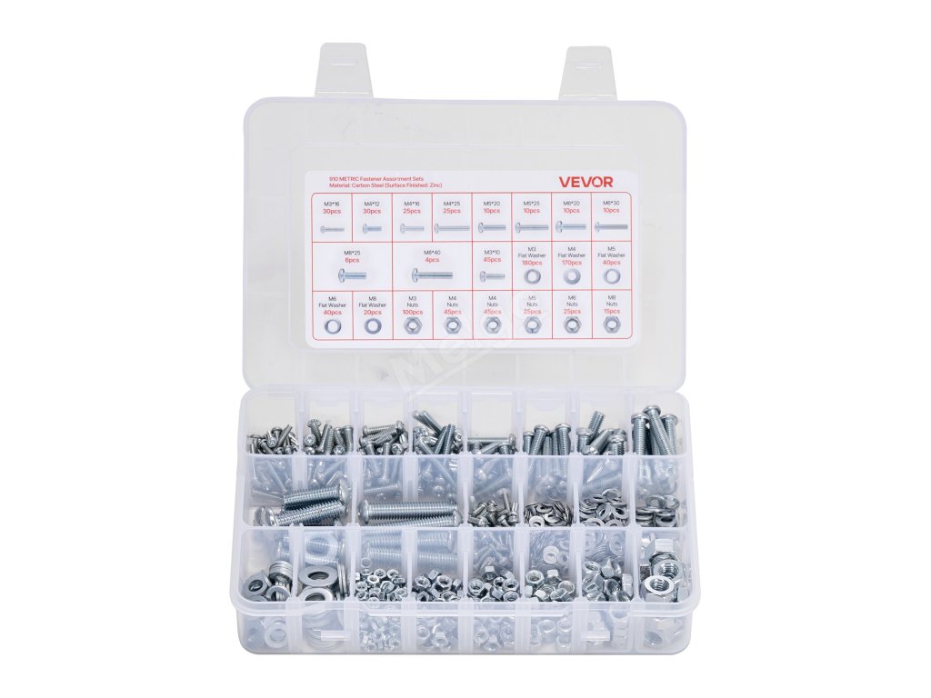 Díky širokému výběru šroubů, matic, podložek a dalších součástí různých velikostí poskytuje tato sada pevná spojení pro různé materiály a usnadňuje nalezení správných dílů pro vaši práci.