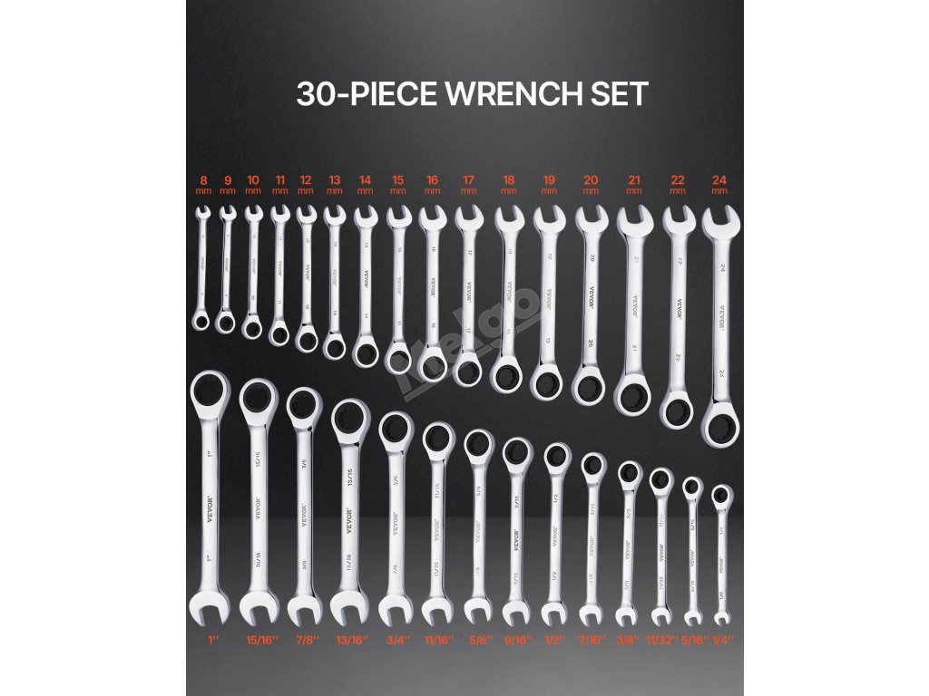 Sada 30 ráčnových očkových klíčů, cr-v, sae 1/4"–1", 8–24 mm