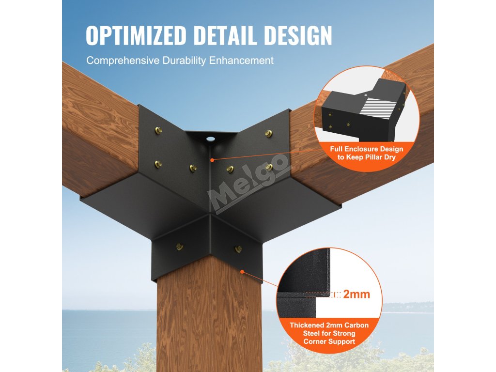 Naše konzoly pro pergoly jsou odolné a robustní a jsou navrženy tak, aby chránily dřevěné trámy před dešťovou vodou a ostrým slunečním světlem.