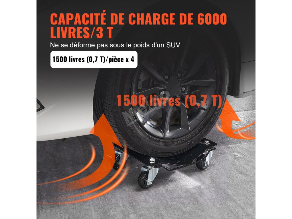 Vozík na kolečkách je vyroben ze zesílených ocelových panelů a bez námahy zvládne vozidlo o hmotnosti až 1 500 kg, což zajišťuje celkovou nosnost 6 000 kg (4 ks). Je vyroben tak, aby vydržel, zůstal pevný a nepoškozený i při podpírání těžkých vozů SUV.