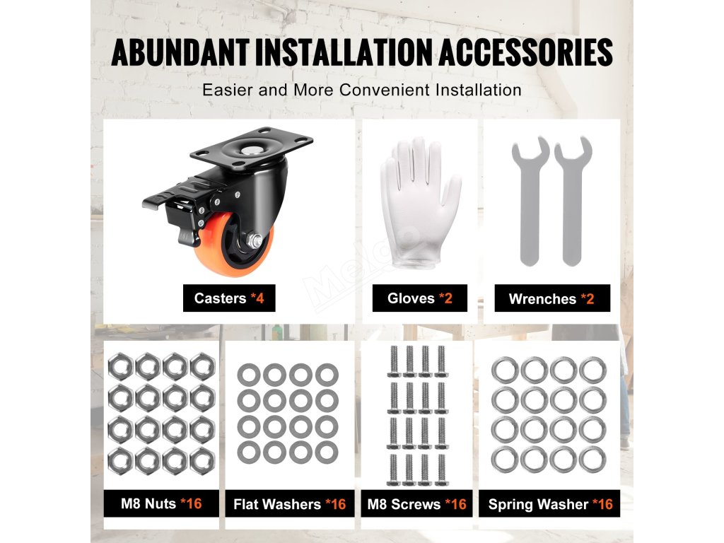 Naše kolečka pro počítačové židle se dodávají s rozsáhlou sadou montážního příslušenství, takže se snadno instalují a přizpůsobují různým způsobům montáže.