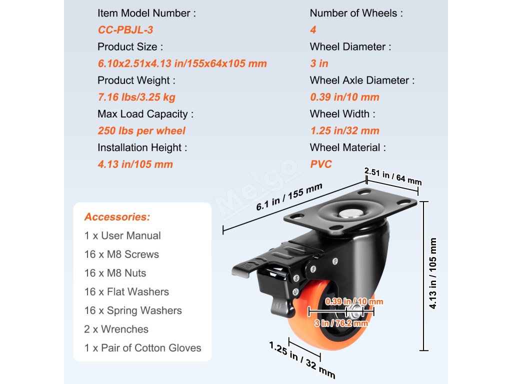 | Průměr kol | 3 palce 76,2 mm |