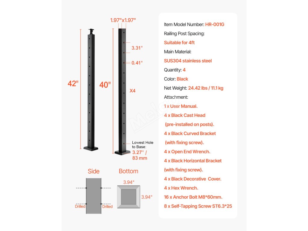 Sada 4 sloupků kabelového zábradlí 42×2×2 in, nerez, předvrtané